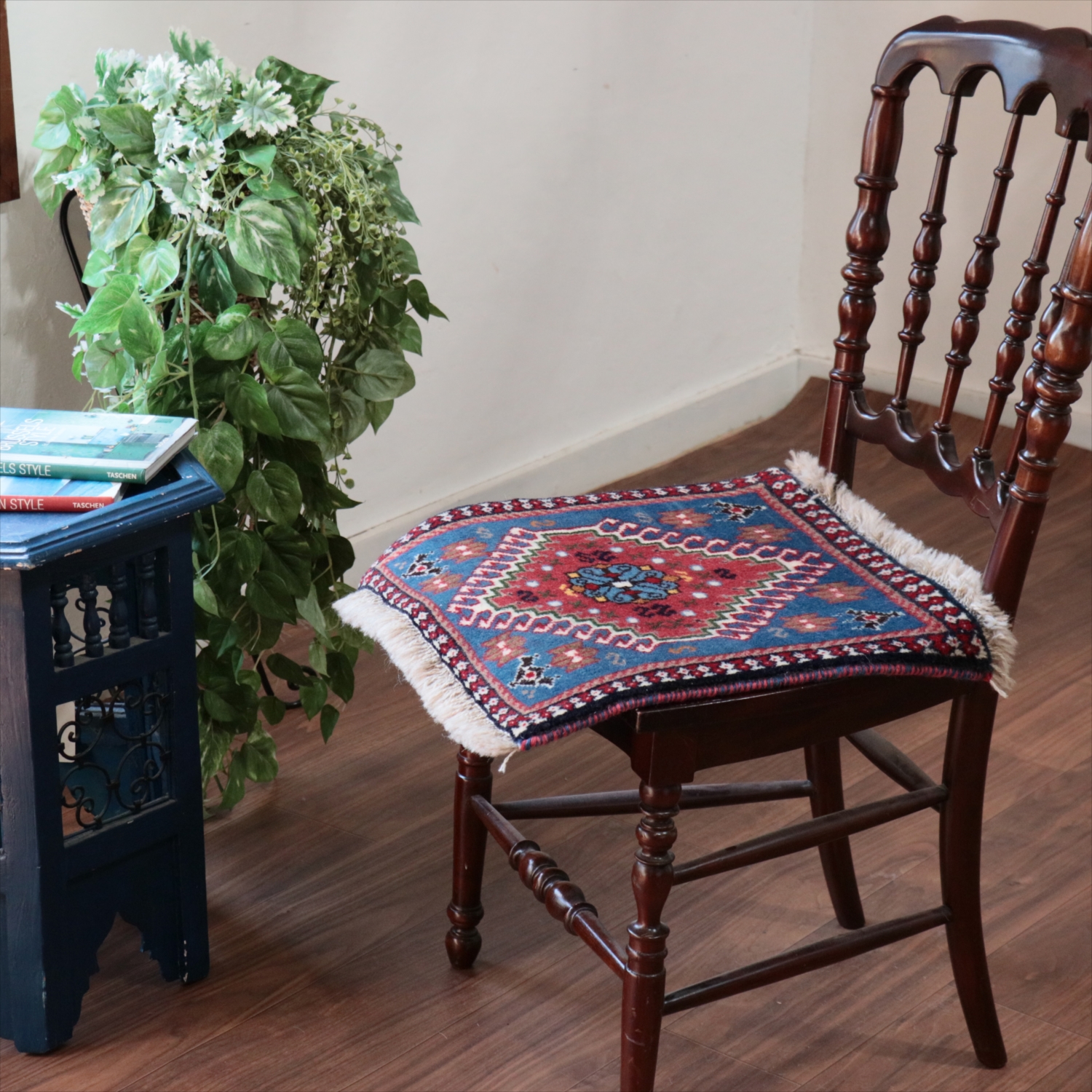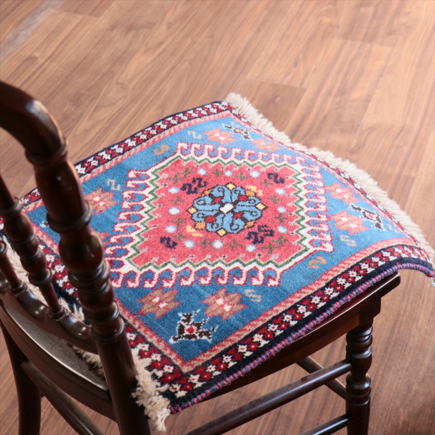 | 40cm角のミニサイズのラグ。小さいながらも、織りはしっかりしていて本格的です。多少ゆがみが気になりますが、ゆがみも含めて素朴な感じをお楽しみいただければと思います。 |