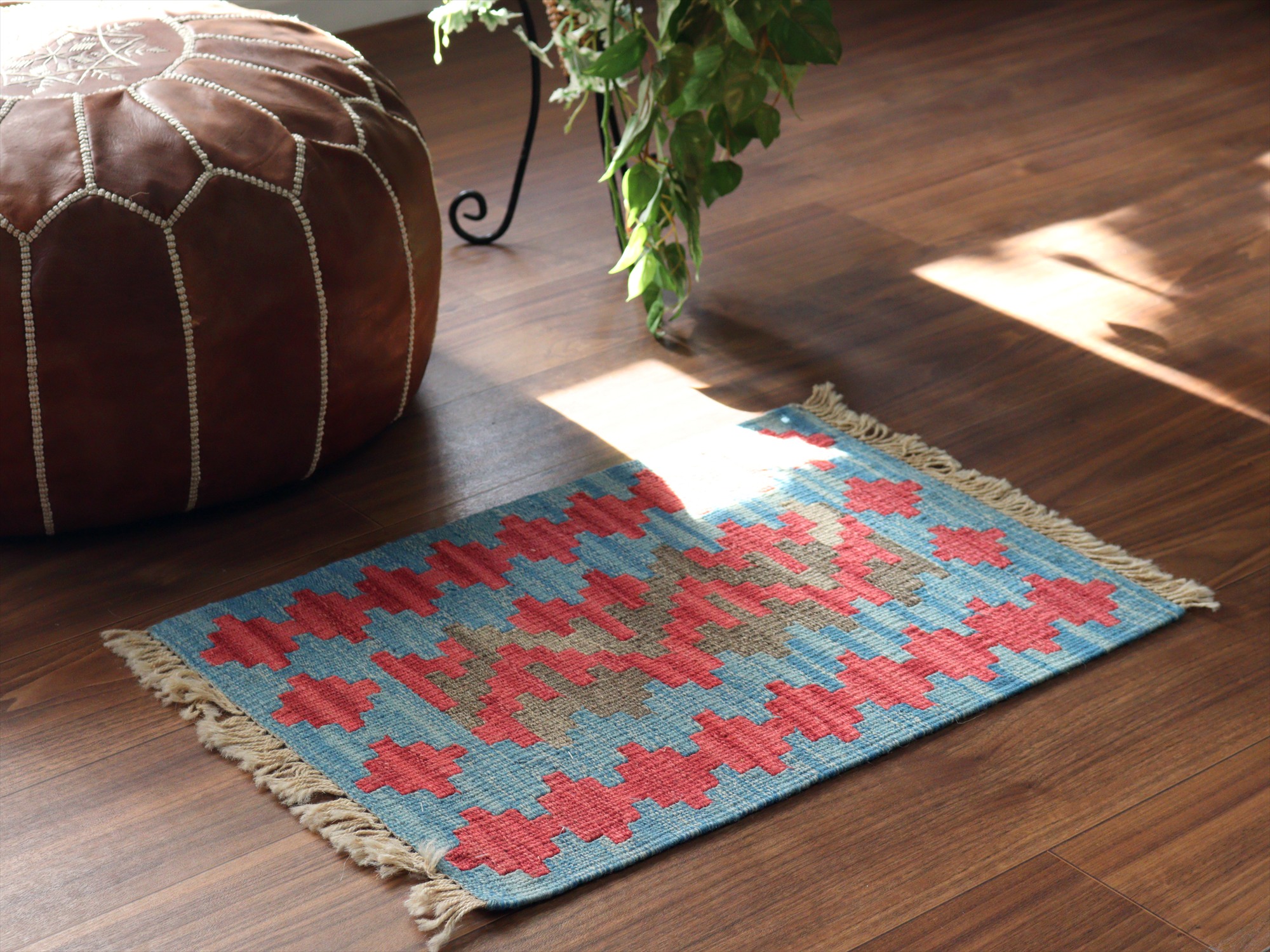 | しっかりとしたハリのある織りで、厚みは4mm前後。多少カタチがゆがみがありますが、手織りキリムならではの味わいとご理解ください。 |