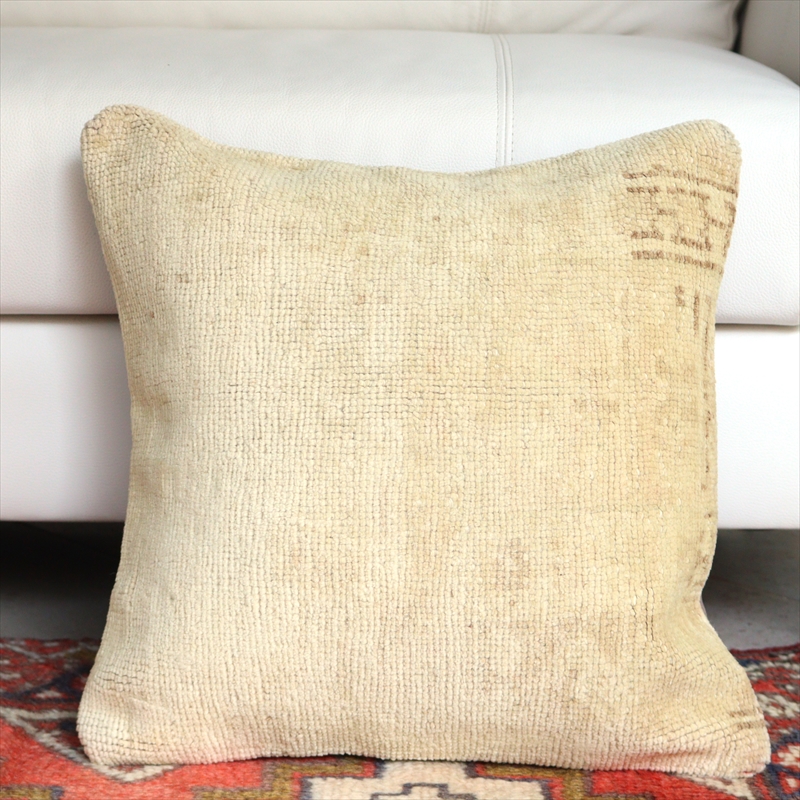 オールドカーペットをブリーチして作られたクッションカバー。モノトーン系の渋い色合いと、素朴で落ち着いた印象が魅力です。パイルは短めで、結び目が見える部分があります。