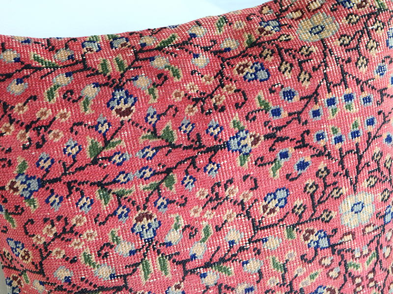 | オールドカーペットのクッションは、長い間家庭で使われていたり、ダメージがあったりする手織りカーペットを使っているため、表面のパイルはすり減って結び目が見えている部分などがあります。クッションに加工する前には、きれいに水洗いされています。 |