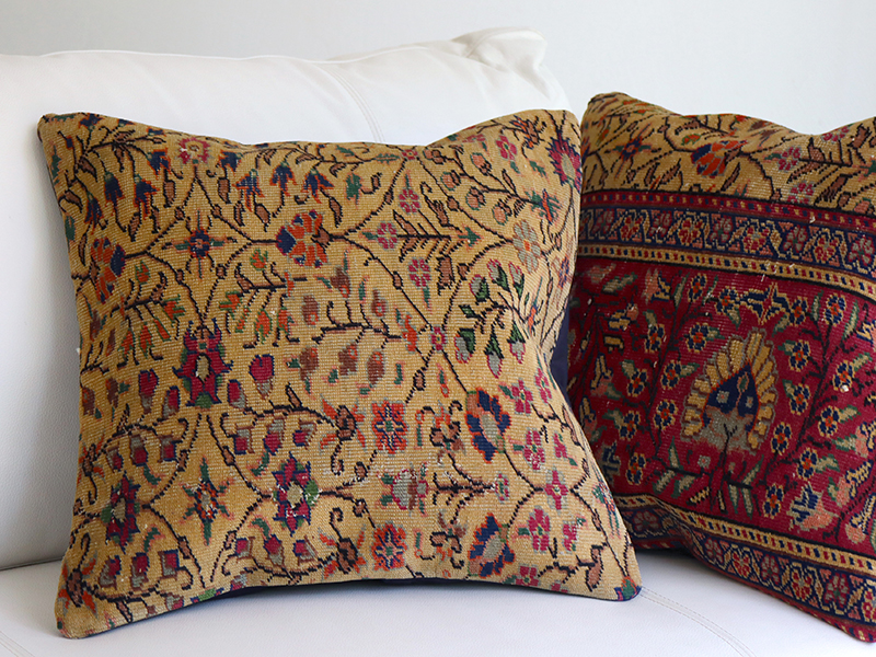 | オールドカーペットのクッションは、長い間家庭で使われていたり、ダメージがあったりする手織りカーペットを使っているため、表面のパイルはすり減って結び目が見えている部分などがあります。クッションに加工する前には、きれいに水洗いされています。 |