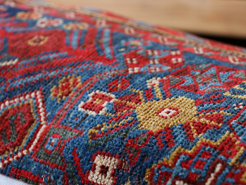 | とてもきれいな色あいのオールドカーペットからのカット。織られてから100年以上は経っている、コレクションにもおすすめのピースです。 ベッドヘッドに、枕と並べて置くのに調度よいサイズのクッションとしてつくられました。細長なので2人掛けのソファに腰あてとして置いてもよさそうです。 |