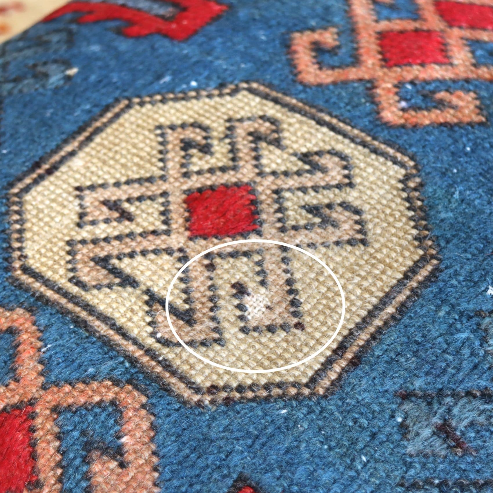 草木染で染めたと思われるブルーの色合いがしっかりと残っていてきれいな一枚。幾何学モチーフがたっぷり詰め込まれたデザインです。パイルのすり減りが均一でなく、毛足が残っているところと、あまり残っていないところがあります。