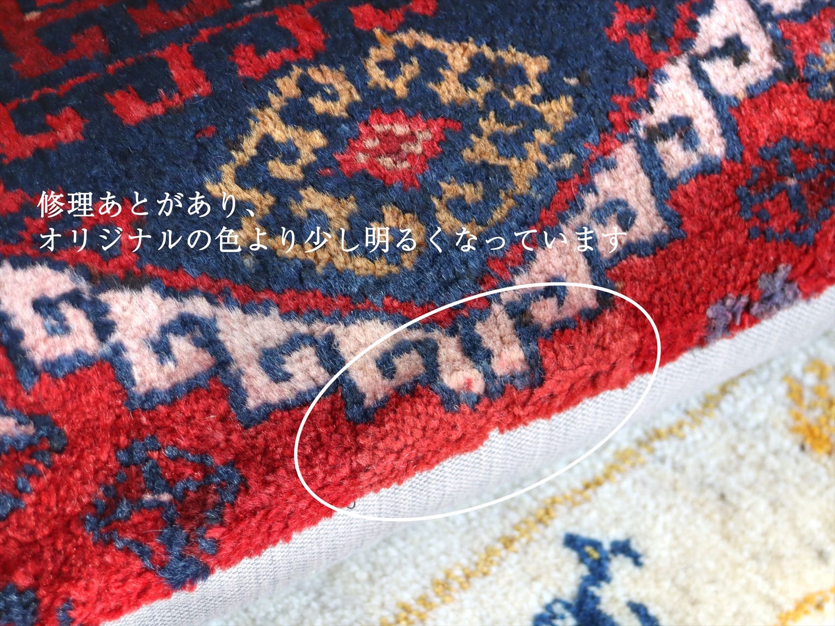 | 上の真ん中部分に修理あとがあります。 オールドカーペットのクッションは、長い間家庭で使われていたり、ダメージがあったりする手織りカーペットを使っているため、表面のパイルはすり減って結び目が見えている部分などがあります。クッションに加工する前には、きれいに水洗いされています。 |