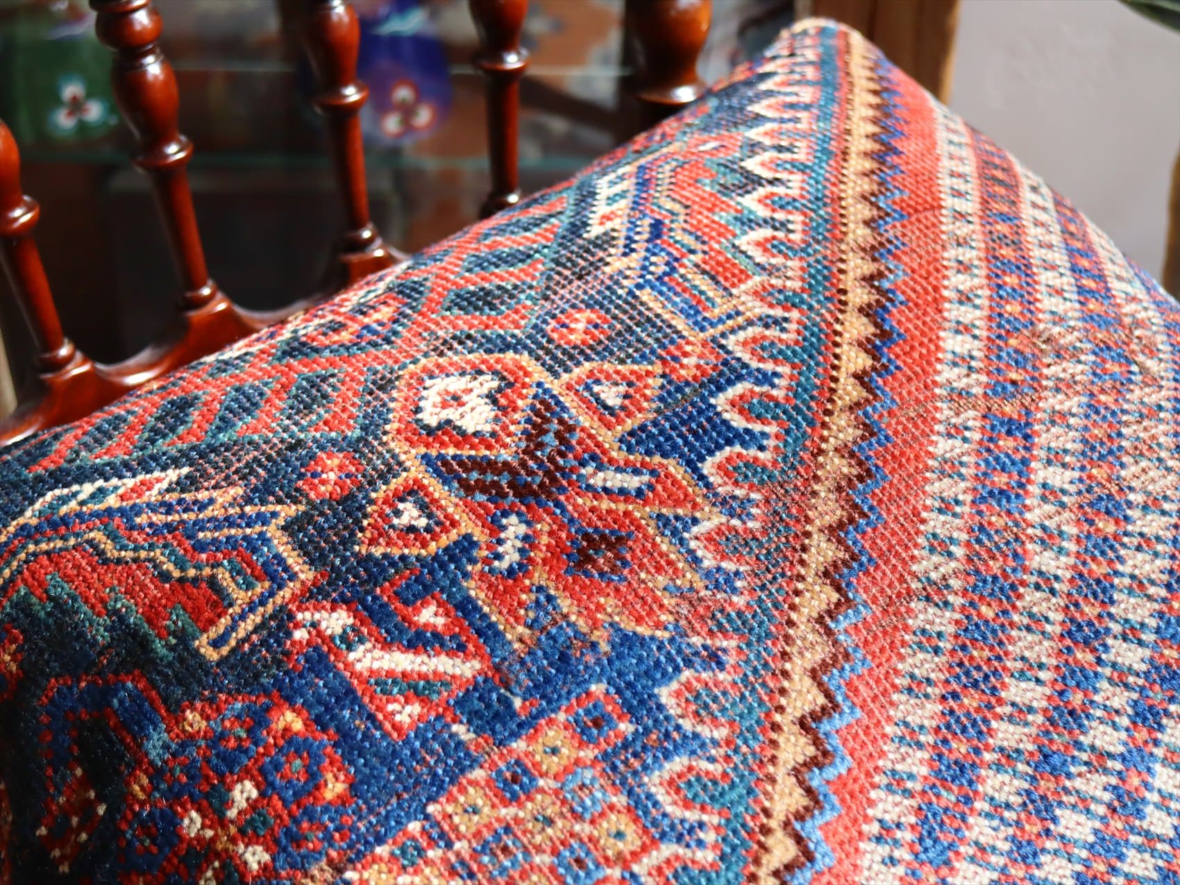 | イラン南部・ザクロス山脈の周辺に暮らすカシュカイ族の織った絨毯。1920~30年頃に草木染の糸を使ってほとんど織られたものと思われます。とても細かな織りとモチーフをたっぷりお楽しみいただける一枚です。カットされてしまうのがもったいないほど古い絨毯を使ったものなので、インテリアとしてはもちろん、コレクションにもおすすめです。 |