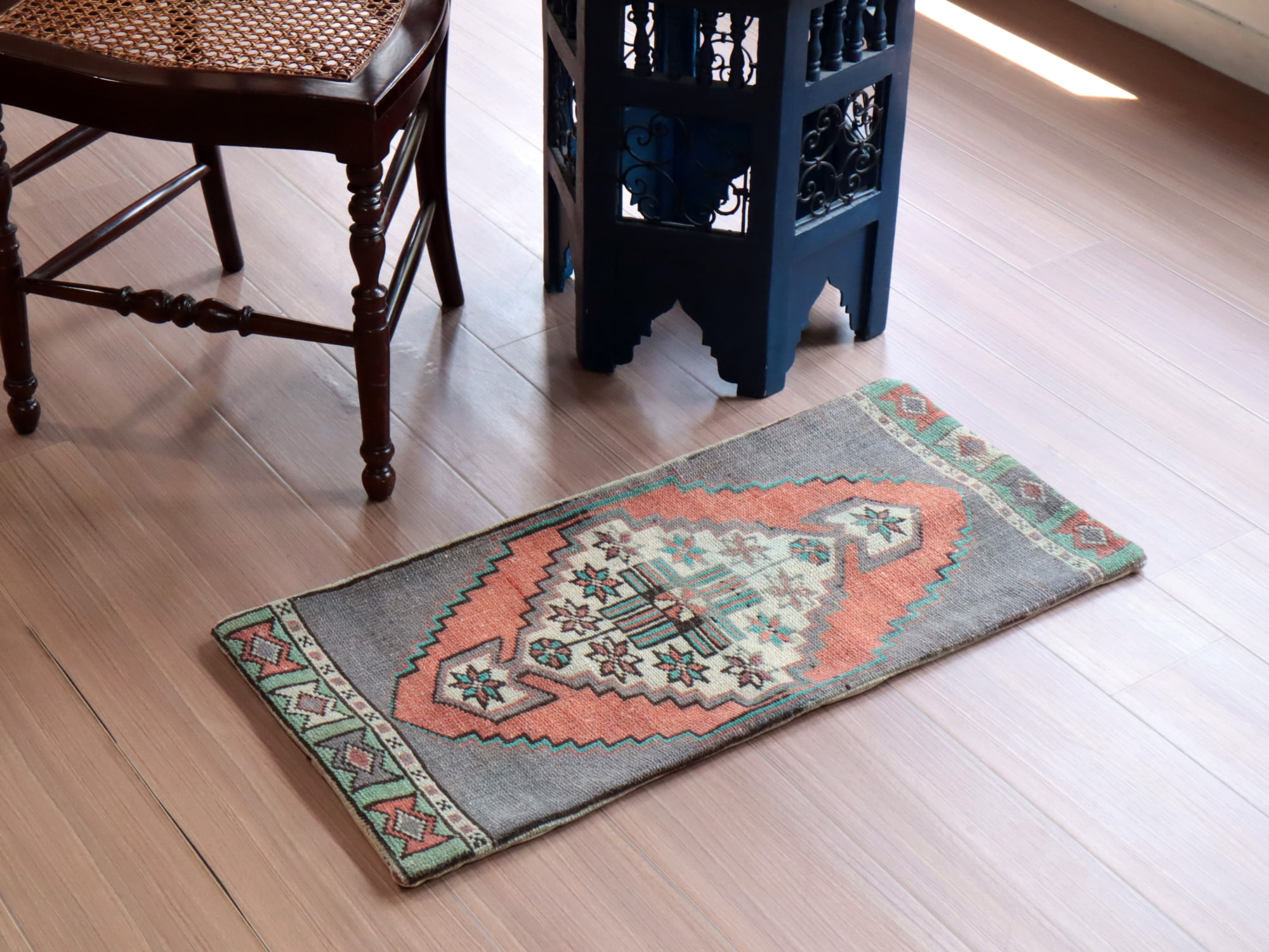 | 毛足が短く表面はやや固めの手触りです。パイル(毛足)がすり減って、下地が見えている部分がありますが、古いじゅうたんならではの味わいを感じられます。 |