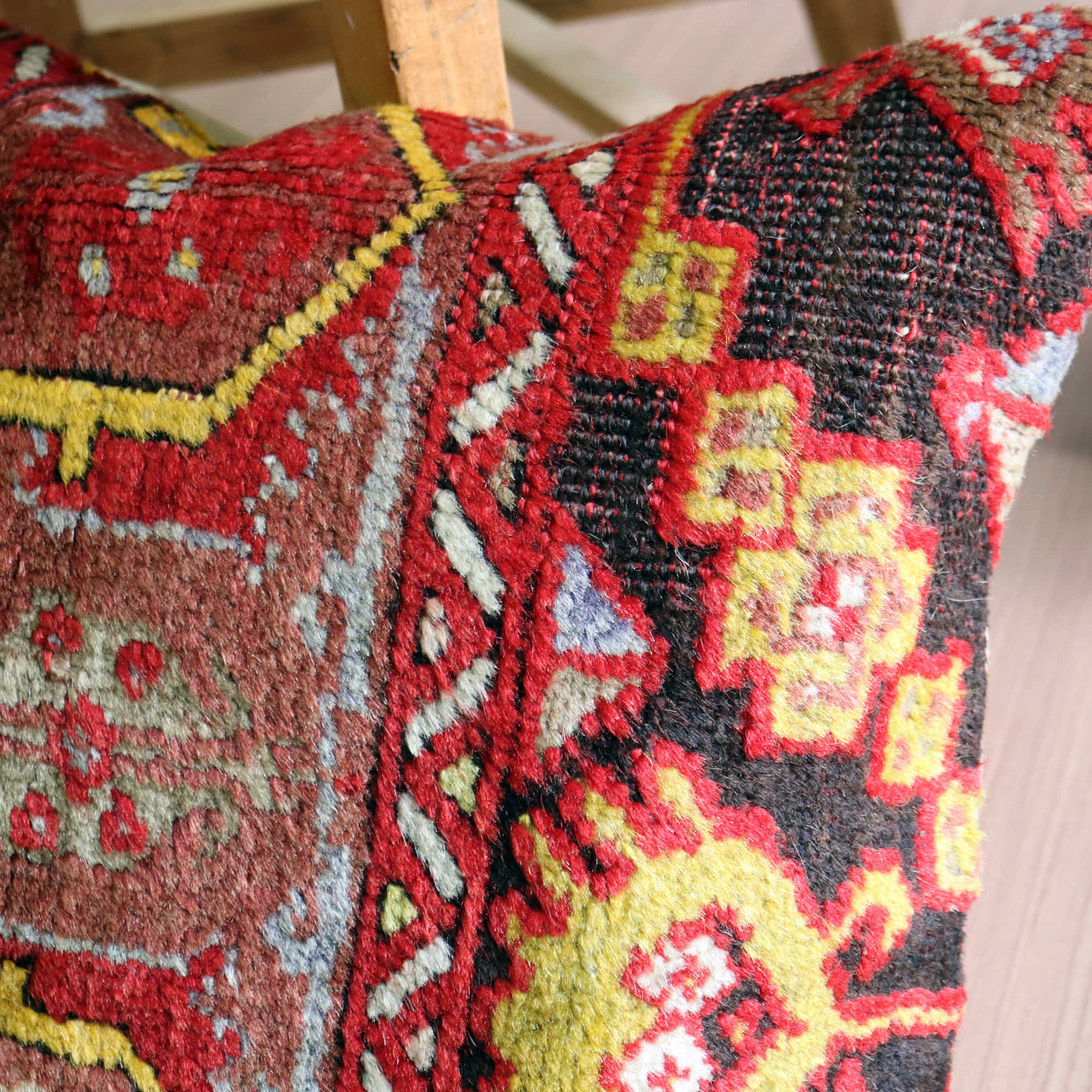 | アナトリア中央部シワス地方で織られた手織りラグを使ったクッションカバーです。織られてから50年前後経過していますが、ほとんど使われていなかった様子で、織られた当時の鮮やかな色を残しています。パイル(毛足)は長めに残っていて、表面はなめらかな肌ざわりです。 |