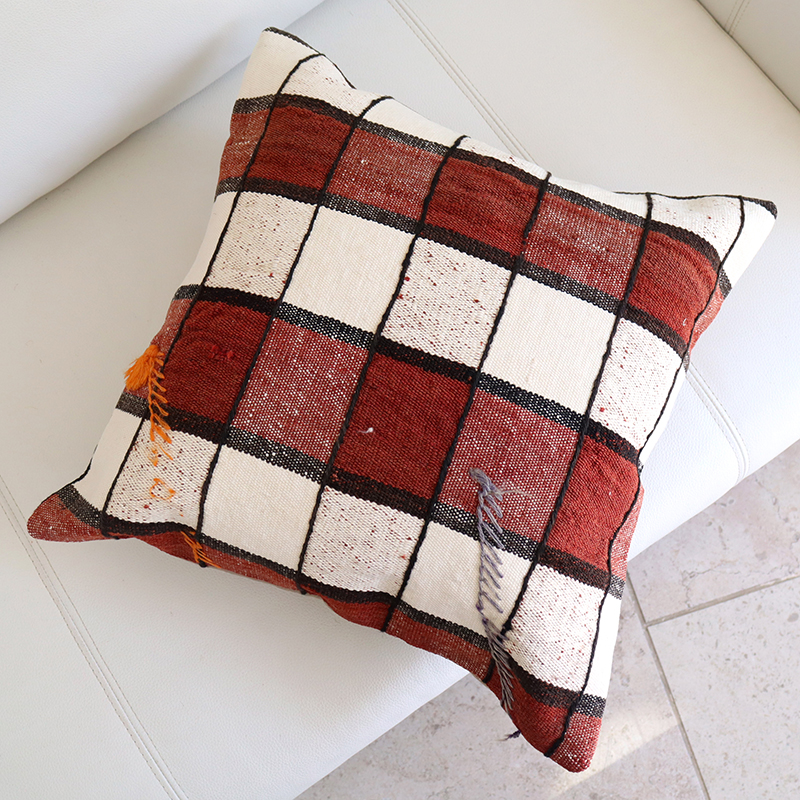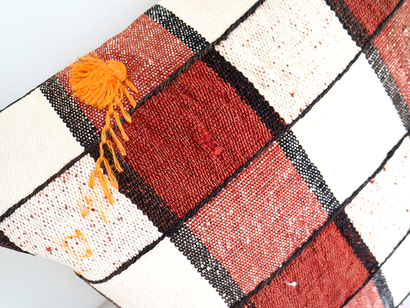 4. オールドキリムクッションカバー 40cm /Old Kilim Cushion 格子柄・ポンポン飾り / ほつれあり OUTLET・難あり品