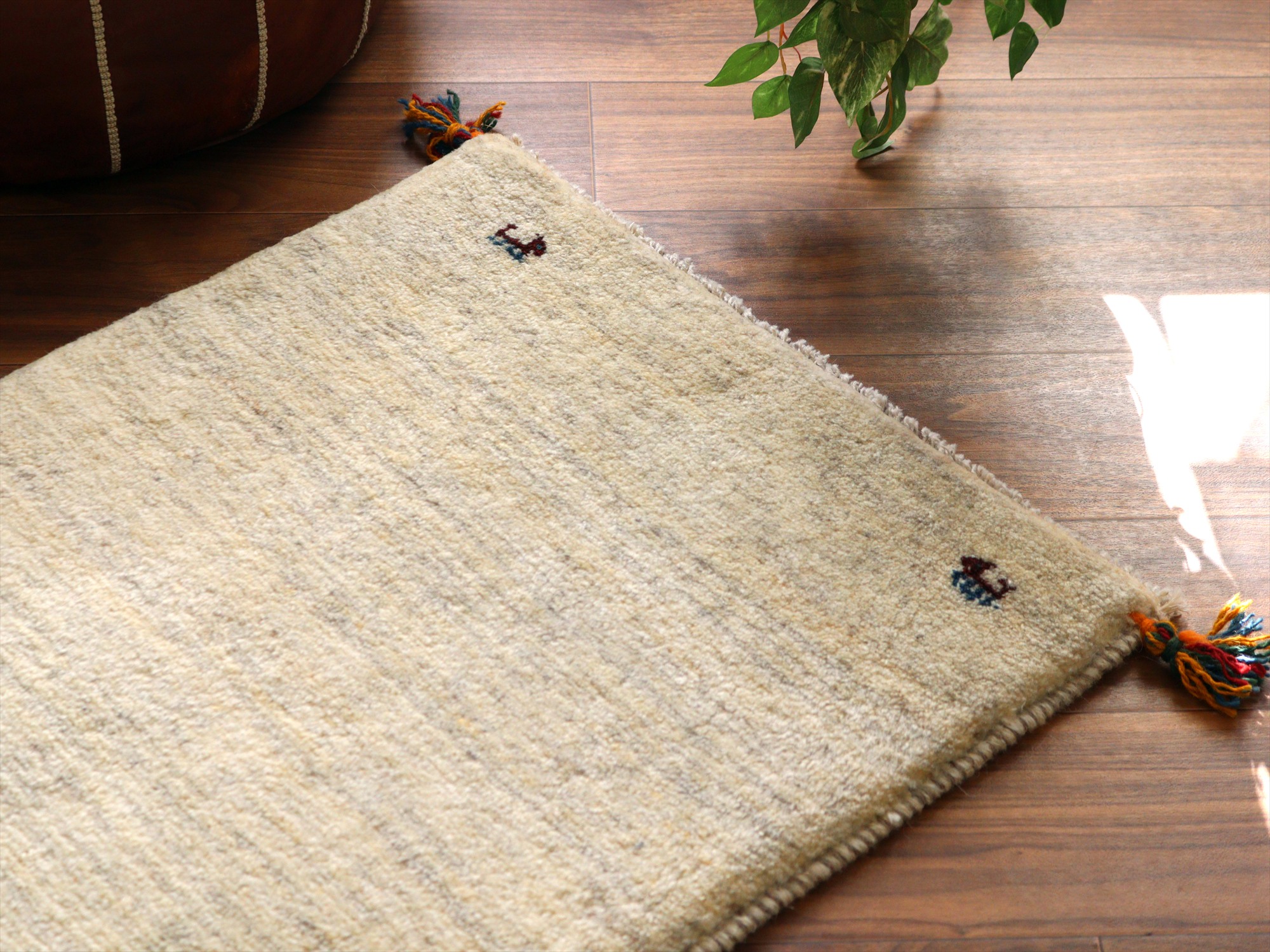ギャッベ イラン産手織りラグ 88x60cm シンプルモチーフ アイボリー