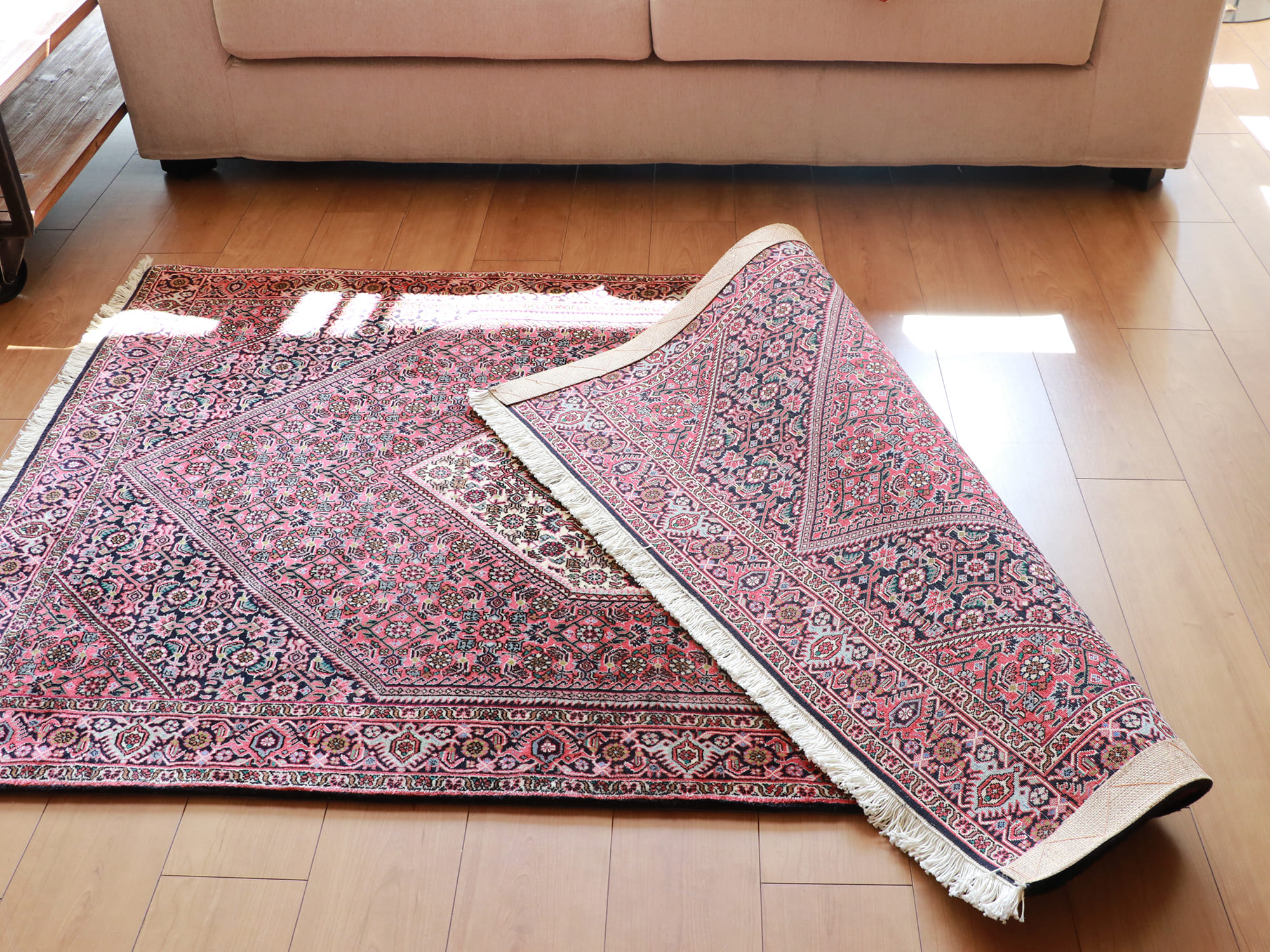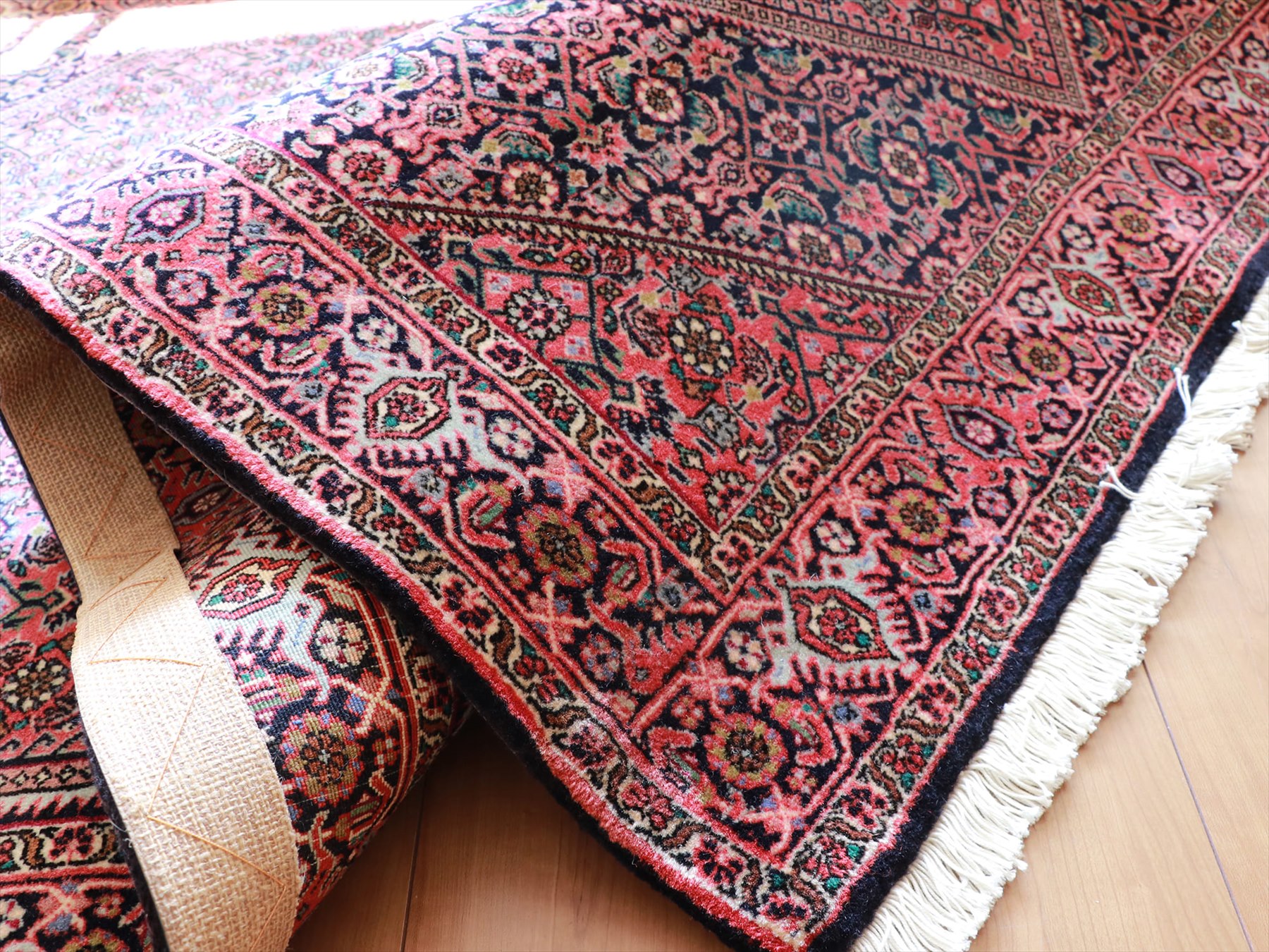 | 裏面の縁にジュートの保護テープが取り付けられています。1980-90年代に織られたもので、長く問屋さんに眠っていたじゅうたん。 |
