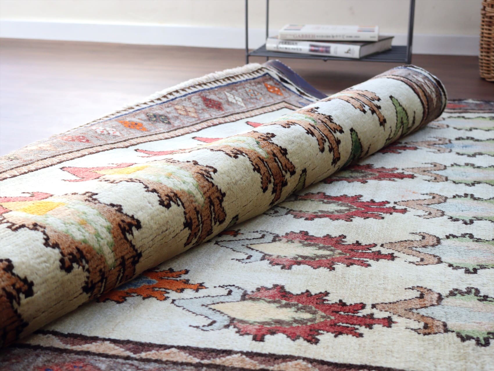 部族絨毯 トライバルラグ227×132cm カシュカイ族の手織りラグ 色とりどりのパルメットの額縁デザイン