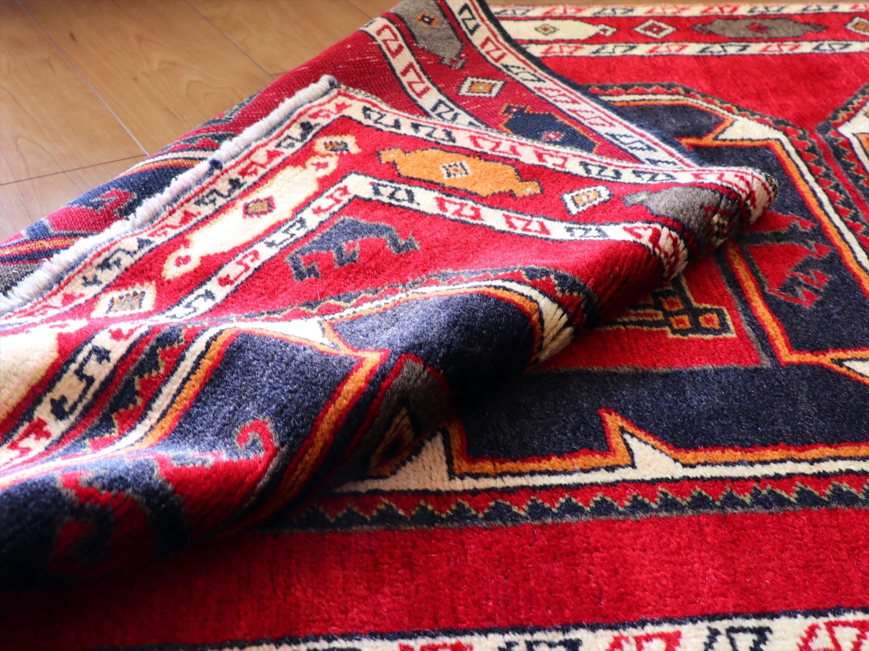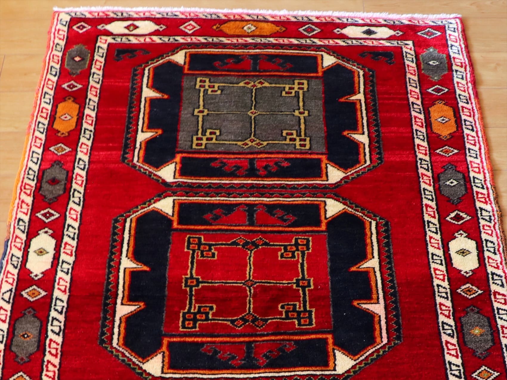 | 深い赤に黒でデザインされた八角形のメダリオンが力強いイメージ。東トルコ、マラテヤ地方で織られたクルド族のラグです。 |