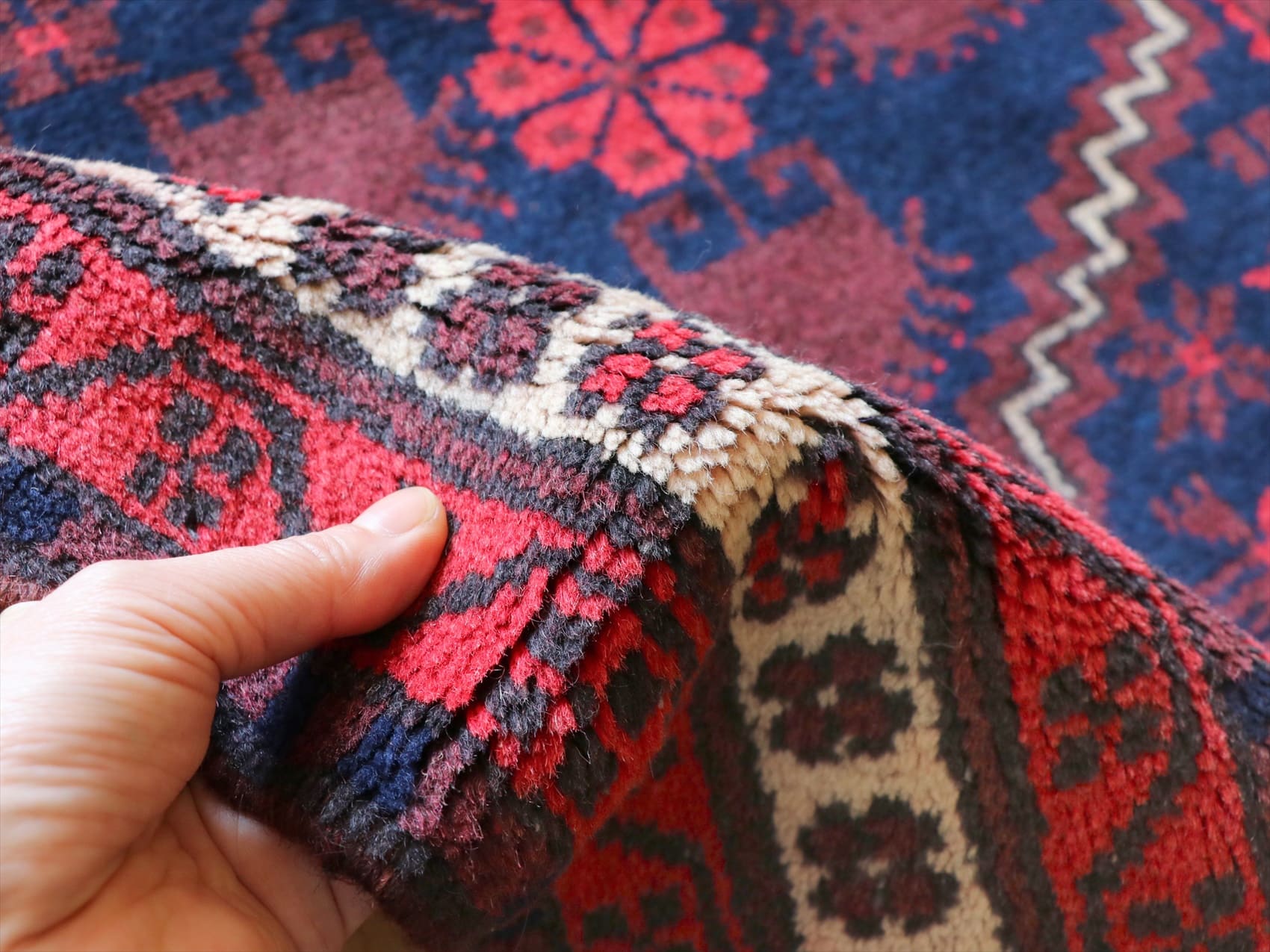 | パイル(毛足)を含めたラグ全体の厚みは1cm弱で、織り地はやわらかかくしなやか。 |