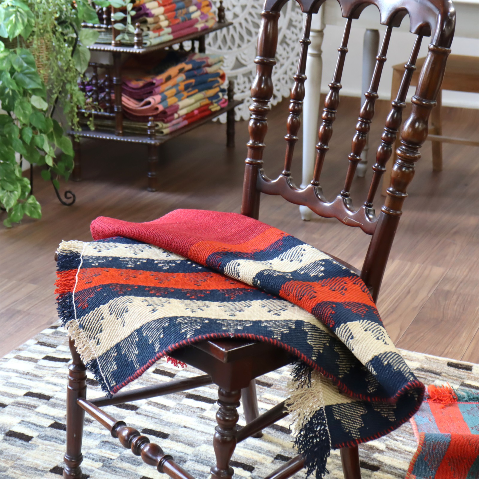 | カシュカイ族の織るキリムは一般的にトルコキリムより厚みがありがっちりとした質感です。織り地は厚みがあり、ぎゅっと目が詰まって、固くしっかりとしています。 |