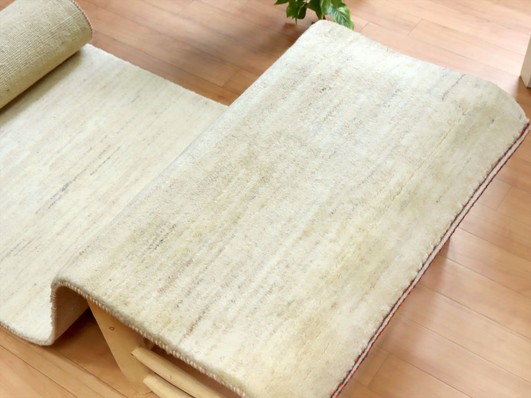 | 染めていない羊毛の生成りのアイボリーのシンプルなギャッベ。ところどころにブラウンやグレーが混ざっており、グラデーションのように仕上げられています。 |