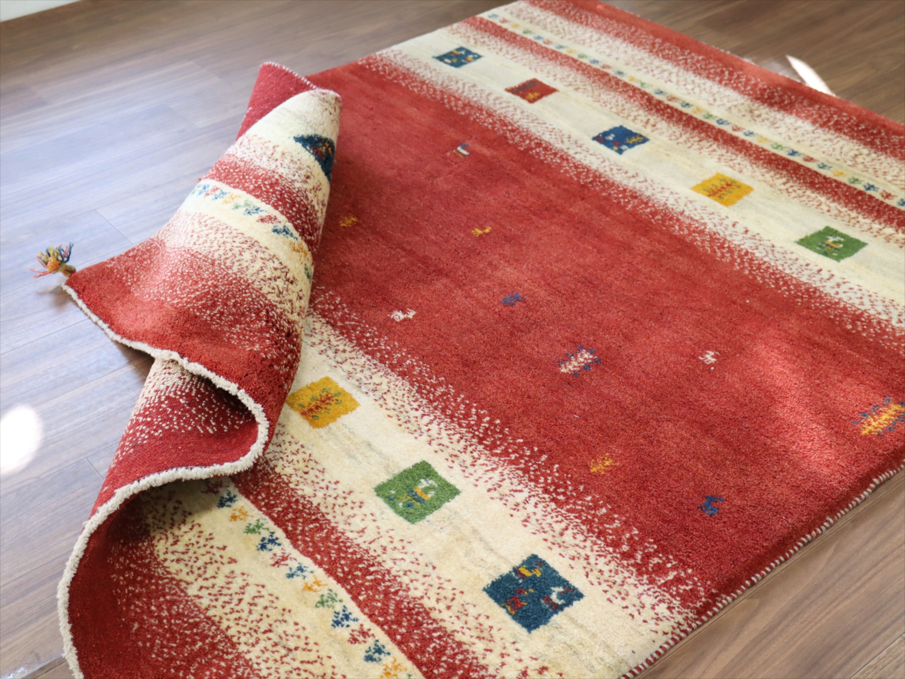 - ギャッベ カシュカイ族の手織りラグ 189x154cm レッド&ナチュラルアイボリー