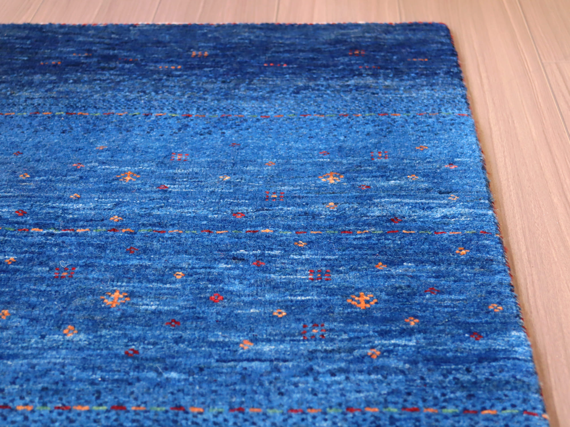 | ブルーの濃淡のグラデーションが美しい最上級の織りの1枚オレンジやレッドの毛糸で織られたドットのラインもまたアクセントになっています。パイル(毛足)の目の方向により、色濃く重厚に見えたり、色鮮やかで明るく見えたりと印象が異なるのも、織り目の細かな最上級のギャベです。 |
