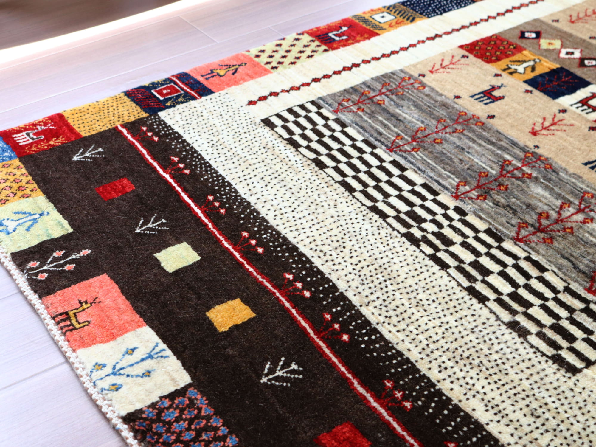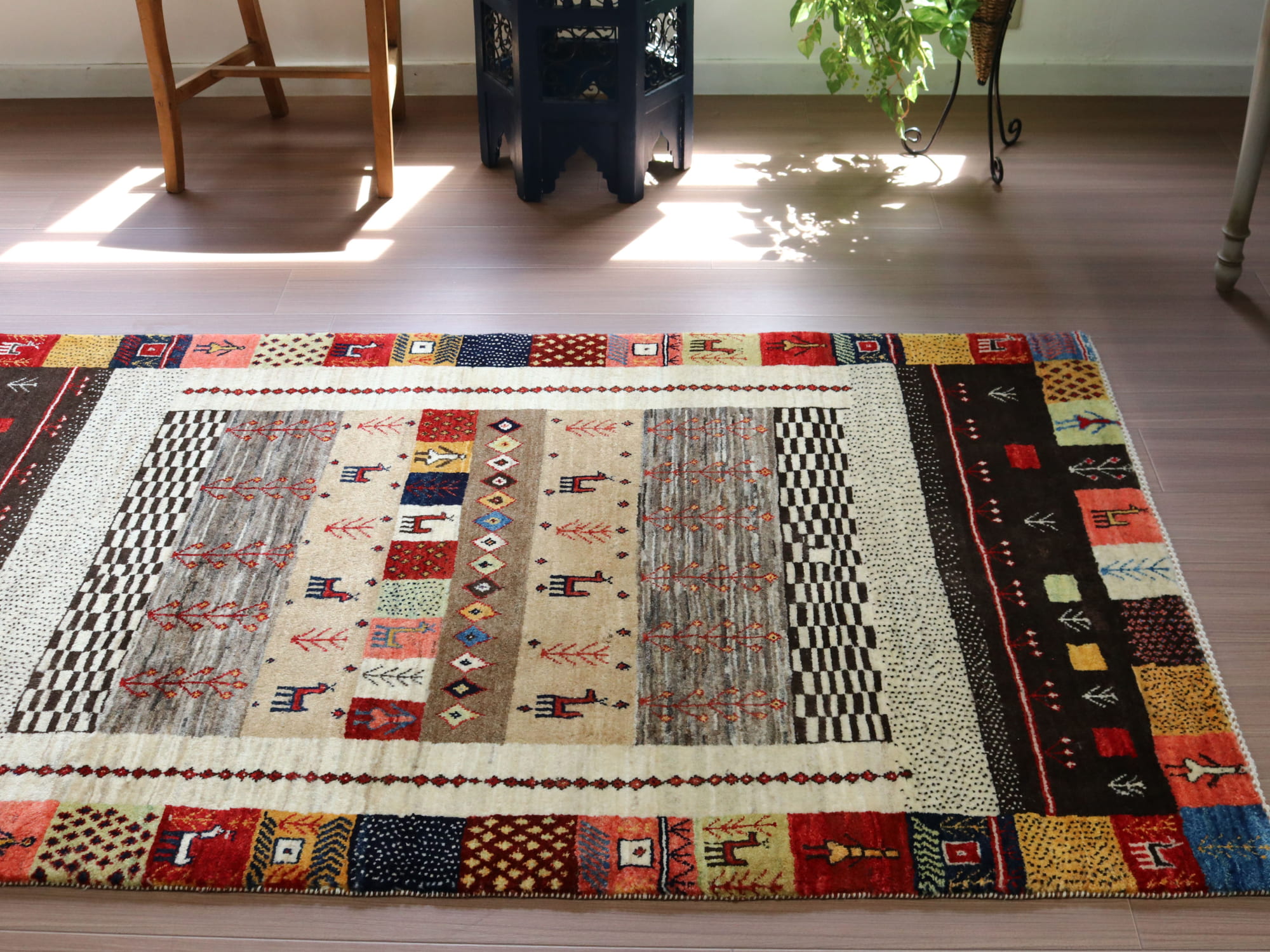 - ギャッベ イラン産手織りラグ バナフシェ 細かな織り 183×109cm 動物モチーフ 幾何学タイル