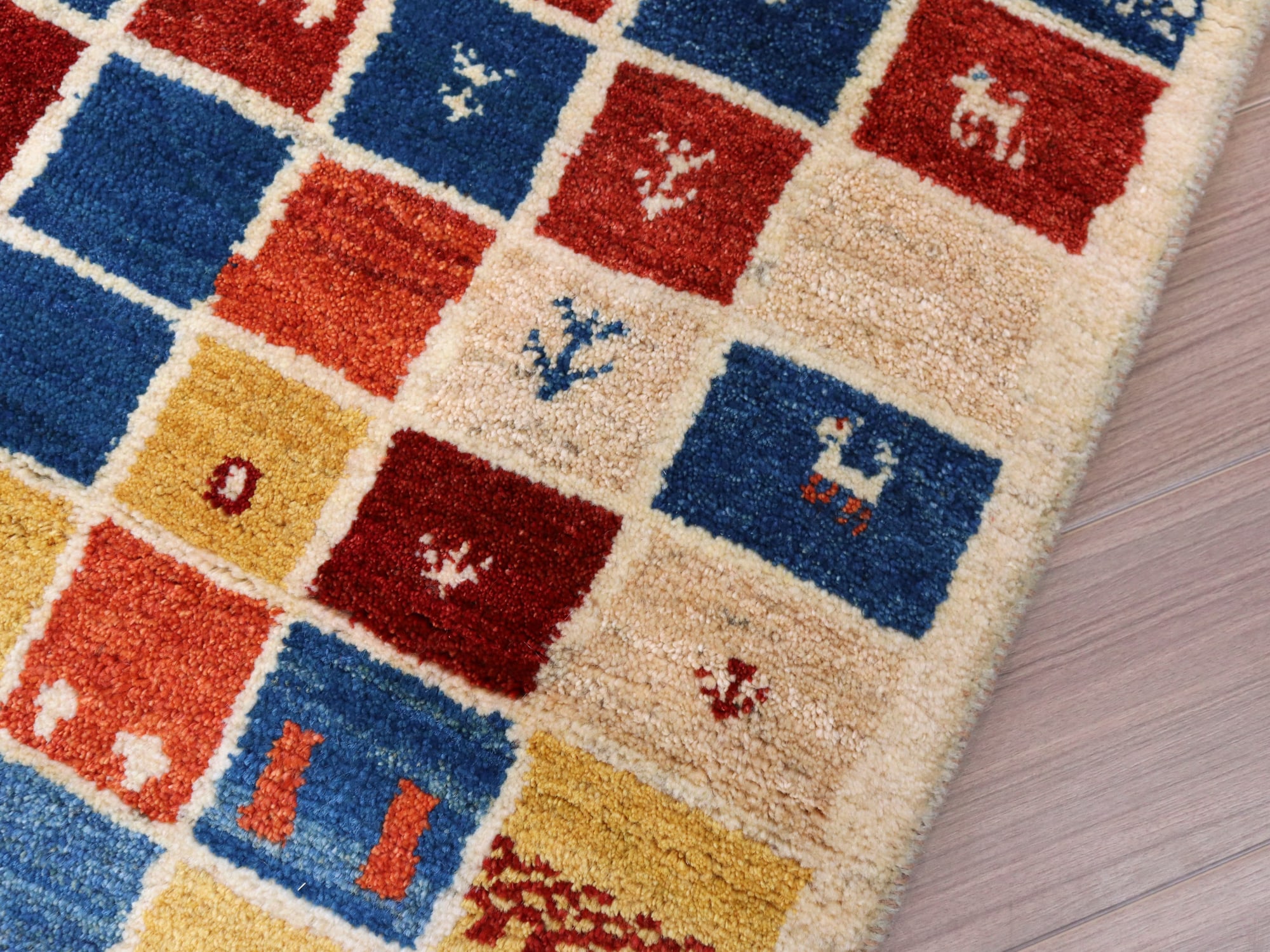 | タイル状に並べられた小さな四角いスペースに、動物や草花、スカートをはいた女の子などが織り込まれています。ポップなデザインのように見えますが、20世紀初頭のギャッベにも同様のパターンが見られ、カシュカイ族の伝統的な表現のひとつであることがわかります。正面から見て上のほうが少し白っぽい枠が多かったり、均一でないところもユニークですね。 |
