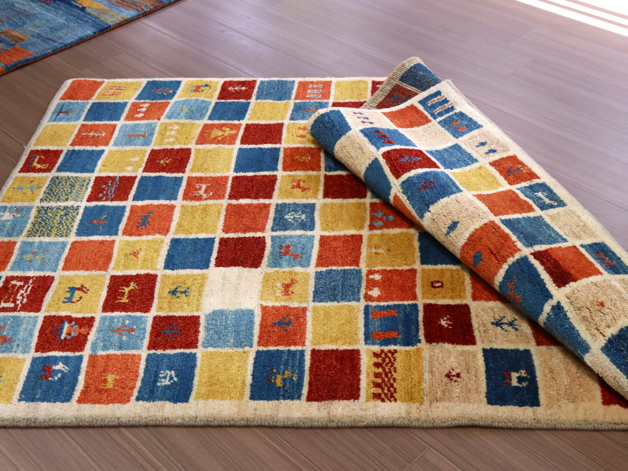 | ギャッベの厚みは毛足とベースを含めて1.4-1.5cm程度。 【ギャッベ・ノマド - Gabbeh Nomad -】遊牧民を意味するノマドと名付けられたギャッベ・コレクション。元来、ギャッベとは、毛足の長いラグを意味し、このクラスの織りの織物のことをいいます。ふかふかした厚みがあります。じゅうたんの織りはざっくり織りで、ギャッベの中で最もベーシックな織りのグレードです。デザインは、遊牧民本来の自由な感性や、長く織り継がれてきた伝統を生かしたものが多く、シンプルな単色のものからカラフルなタイル柄など、様々なデザインが織られています。ヤギやヒツジなどの動物、生命の樹などの定番モチーフが織り込まれていることが多く、一般的にイメージされる「ギャッベらしさ」が一番感じられるスタンダードなクラスです。 |