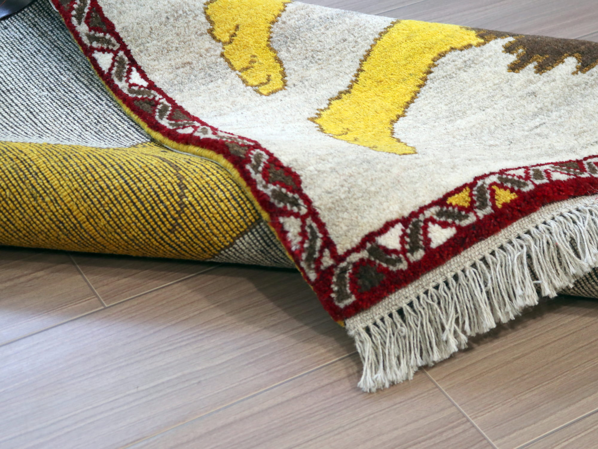 | 染めていない羊毛のアイボリーやブラウン、グレーなどの天然の色をベースに、キレのある目とイエローボディが印象的なライオン。ライオンはギャッベを織るカシュカイ族の象徴ともされていて古い時代から織り継がれてきた伝統的なデザイン。見たこともないライオンを想像して織り込んでいた時代にはユニークなライオンが登場していましたが、こちらのピースは現代になってから織られたもので、写真や映像をみたのでしょう、とても写実的な表現です。 |