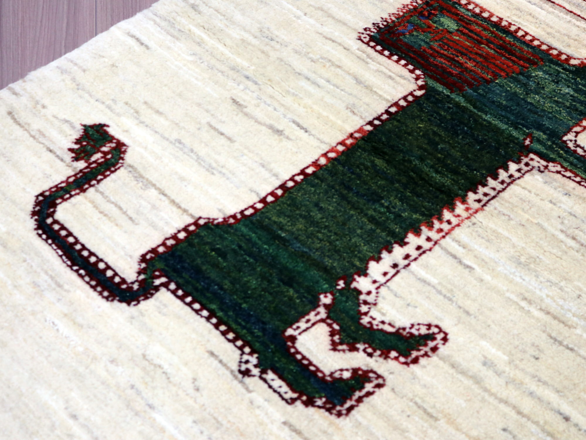 | 染めていない羊毛のナチュラルアイボリーをベースに、カシュカイ族の象徴ともされるライオンのデザインを現代になって織ったものです。片手にサーベルを持ったライオンは歴史的に古くからイラン(ペルシャ)の国旗に使われてきたモチーフ。ライオンの人間のような顔は、夫や父親など身近な人をモデルにしていることもあります。上に伸びた尻尾と太く短い脚の表現がカシュカイ族のライオンギャッベらしいピースです。 |