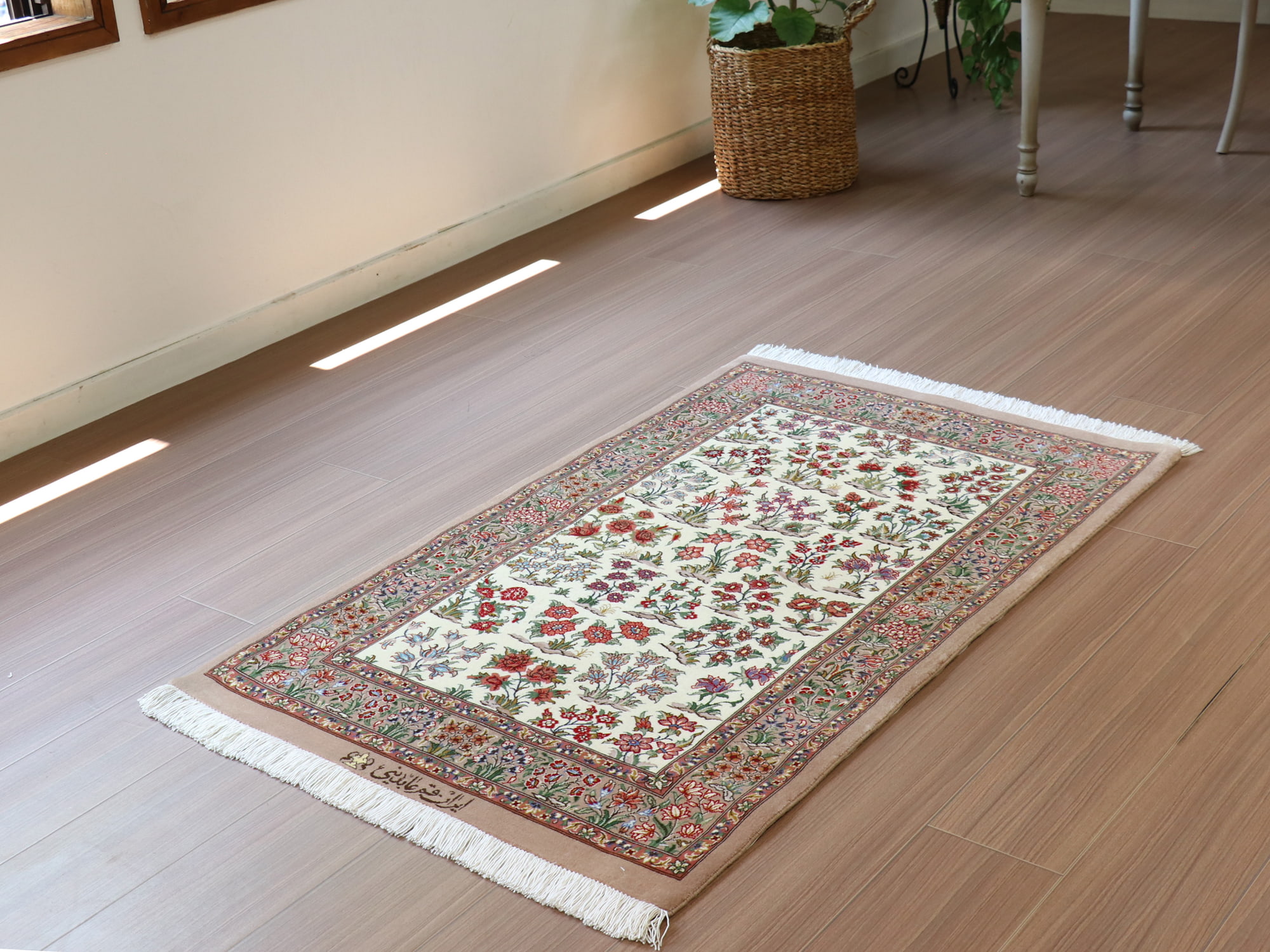 | 様々なお花がランダムな配置で織り込まれています。花瓶の切り花ではなく、地植えの様子が描かれているところがユニークです。周囲のボーダーにも、さらに細かな表現でたくさんの花が並んでいます。単純な繰り返しでなく、隙間を埋め尽くすような花が、とても手の込んだデザインです。 ペルシャ文字は「カマル・アブディニ」と書かれていて、この絨毯を織った方(またはデザインした方)のサインということです。 |