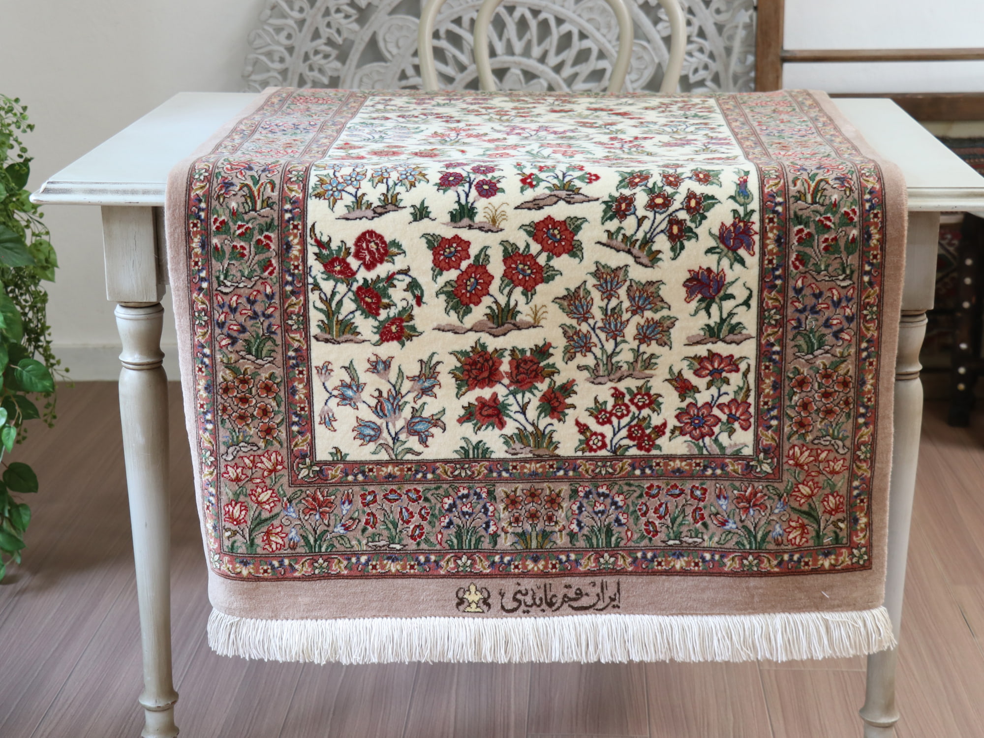 ペルシャ絨毯 クム123×75cm 草花 アイボリー ベージュ