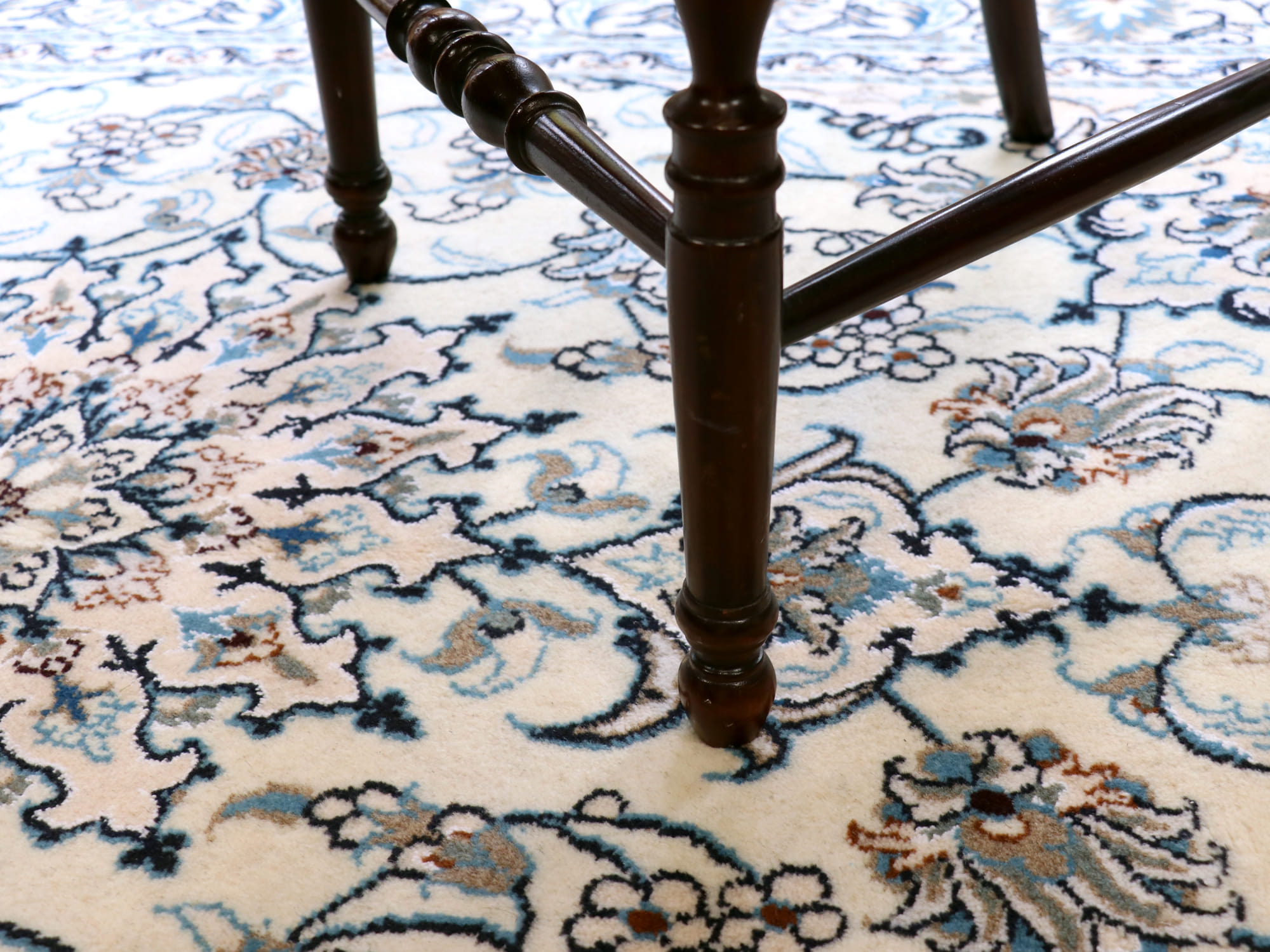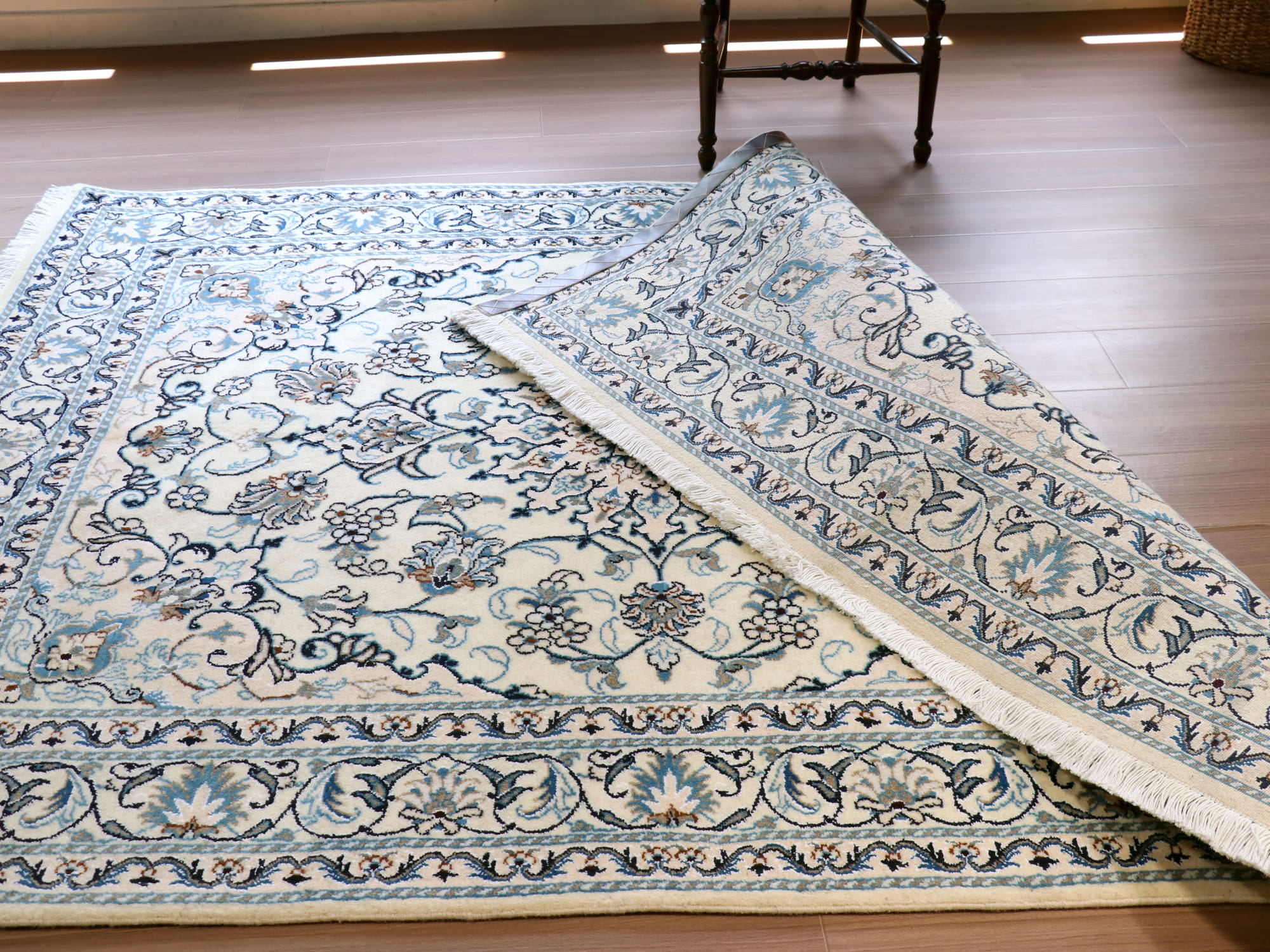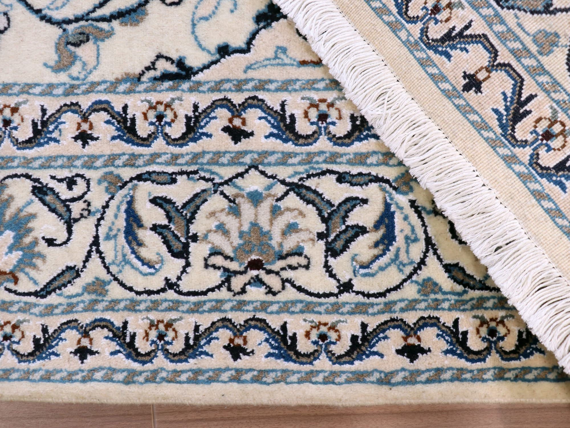 | バランスのとれた美しい花のアラベスク。アイボリーをベースに、ネイビーブルーの輪郭、花やパルメットは淡いベージュ、ピンク、水色が使われています。ナイン産の手織り絨毯としては、緻密さよりも実用性にこだわった織りで、リーズナブルな価格が魅力です。 |