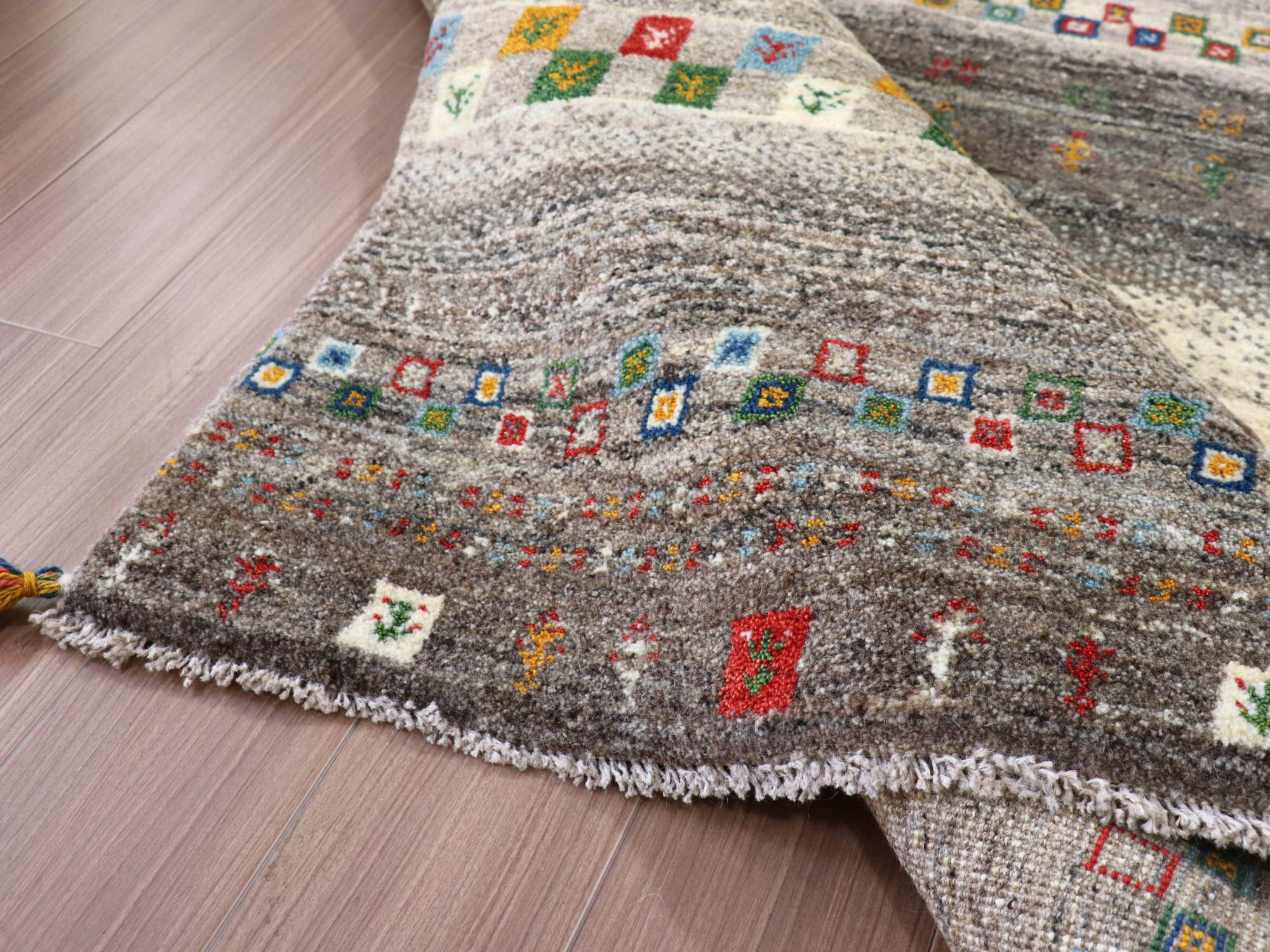 | 羊毛と言えば白っぽい色を想像されるかもしれませんが、ブラウンやグレーなど天然の羊毛はかなり色の幅が広いのです。このギャッベは、グレー系とアイボリー系の染めていない天然の羊毛の色をいかして織られたのボーダー柄のギャッベ。ところどころ、カラフルなスクエアや動物や植物などのモチーフを織り入れた1枚です。色の境目部分にはドットが入っています。 |