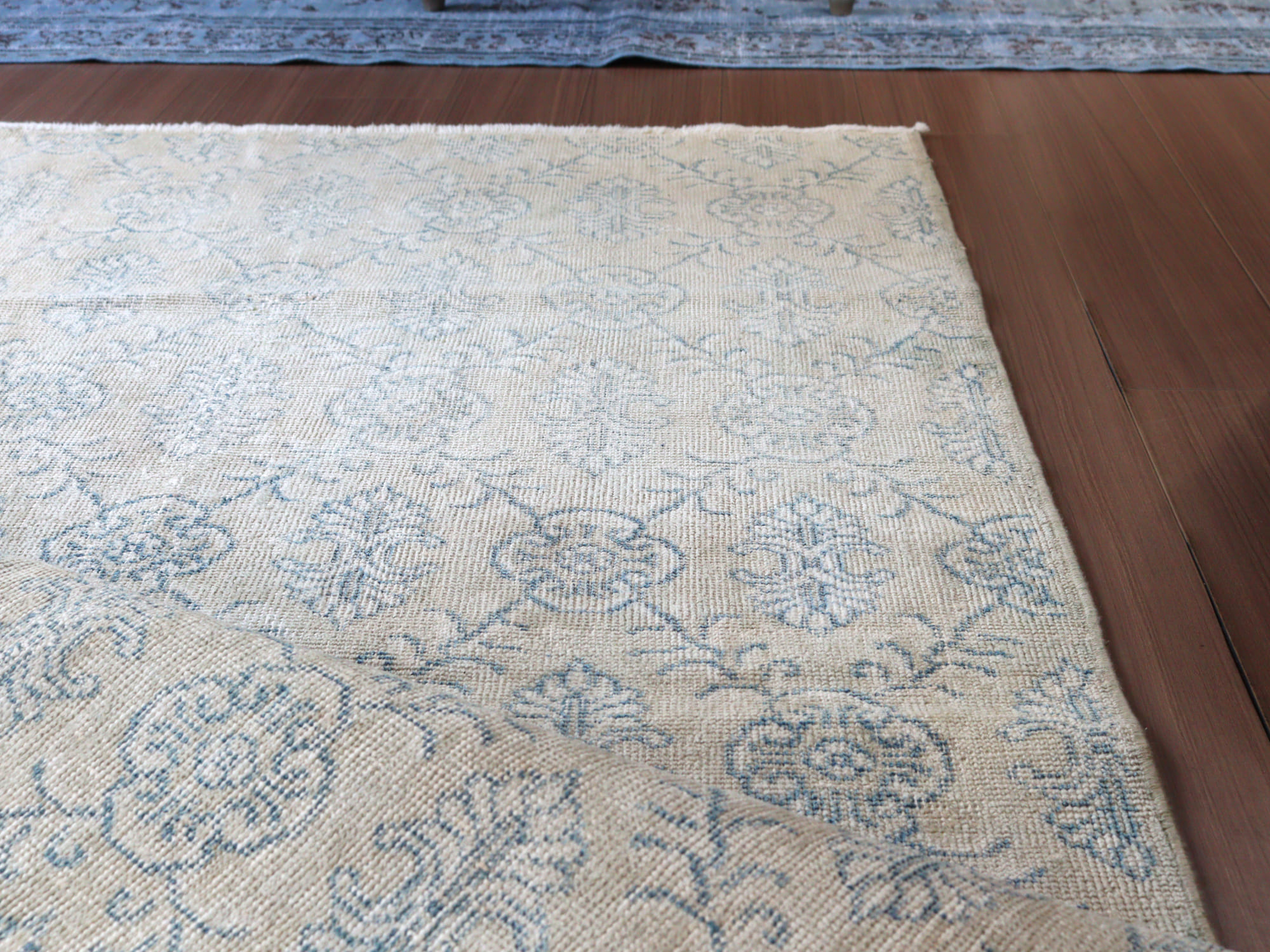 | ダメージが多く、使われなくなった古い手織りカーペットを、洗った上でブリーチをかけてあります。色褪せた中にもオリジナルのデザインが薄く見えて、ヴィンテージ感のある仕上がりです。周囲の額縁がないテキスタイルのようなデザインのラグです。 |