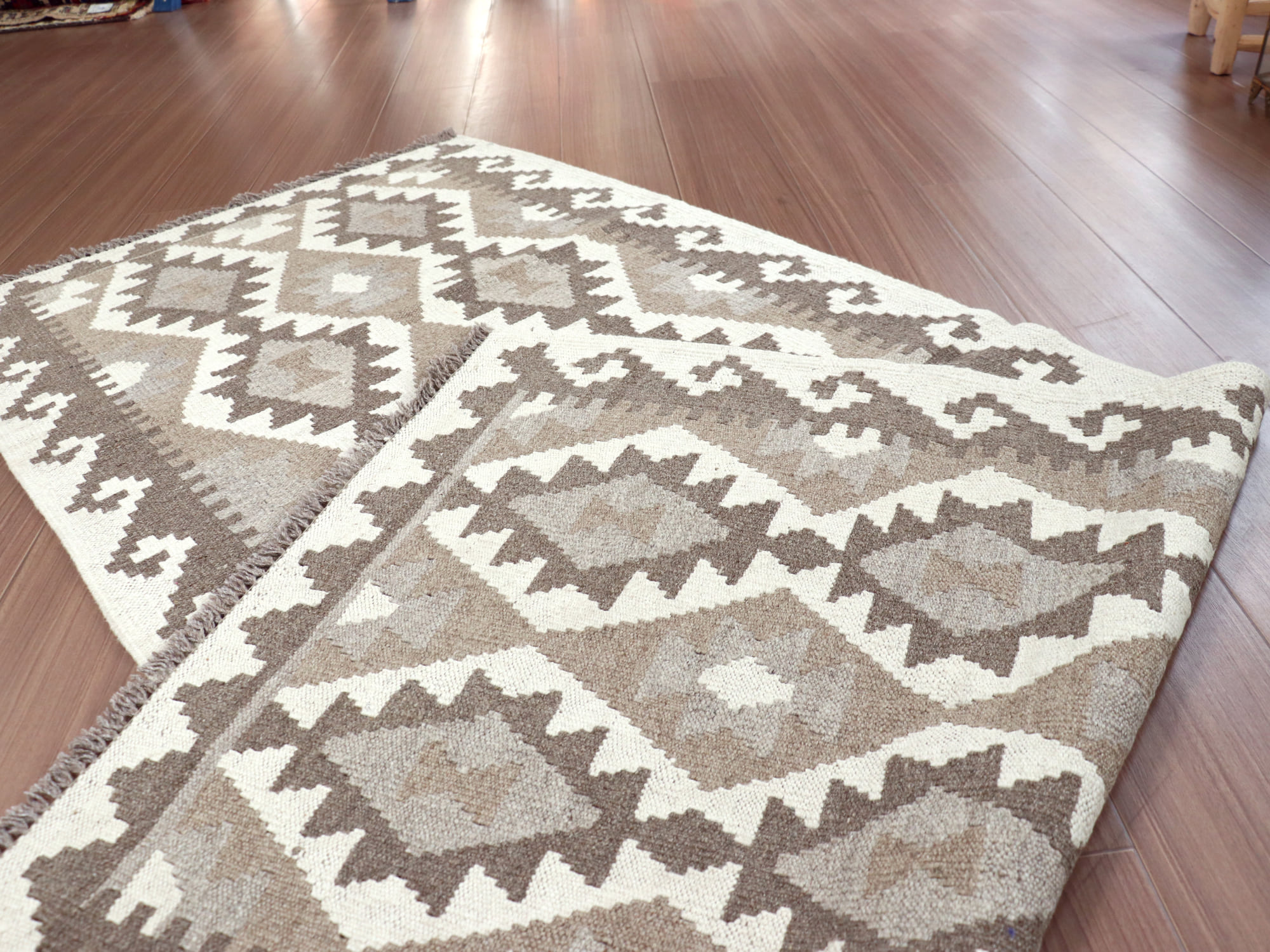 | アフガニスタンで現在織られている、手織りのウールキリムです。経糸にグレーの羊毛が使われているほか、上下のフリンジは丁寧にカラフルな糸で巻いてあります。 染色した色はなく、天然の羊毛の色のみを組み合わせて、幾何学モチーフが織り込まれています。写真のようにフロアの色がキリムと同系色でコントラストがないと、落ちついた印象になります。こげ茶や明るいナチュラルウッドなどのフローリングでは、もう少し存在感が出てアクセントになることと思います。 |