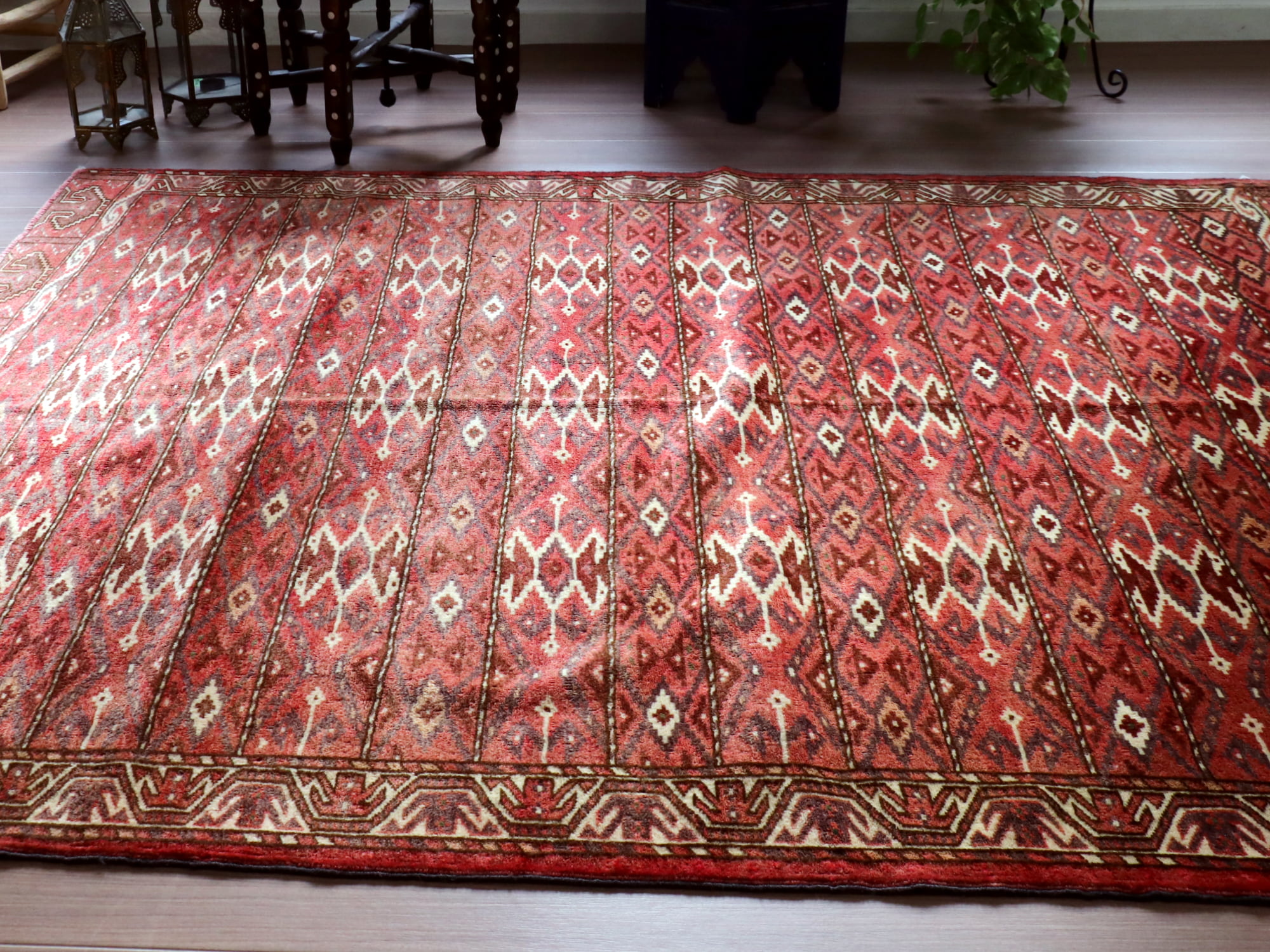 | 中央アジアの広い地域で暮らしていたトルクメン部族の中でも、もっとも西のエリアに住む「ヤムート(ヨムート)」族の織ったカーペットです。深い赤が特徴の絨毯ですが、このピースは日焼けによってかなり明るめの色に褪色しています。裏面をみると、日焼けしていないもとの色が見られます。元は濃い紫だった色は、褪色してグレーっぽく変化していて、ラグ全体がやさしい雰囲気になっています。 |
