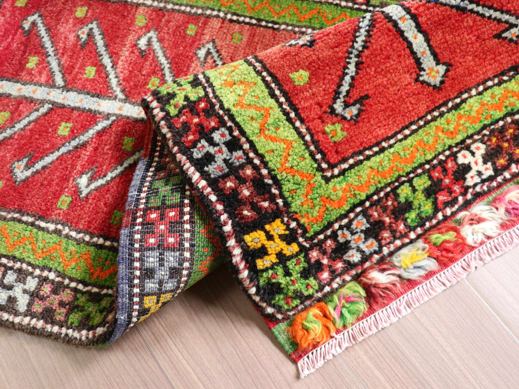 | 毛足が長く、パイルを含めたラグの厚みは1.6-1.7cm程度で、トルコ絨毯としてはかなり分厚くボリュームのある質感です。上下のキリム部分には、カラフルな毛糸でおまじないのポンポンが付けられています。 |
