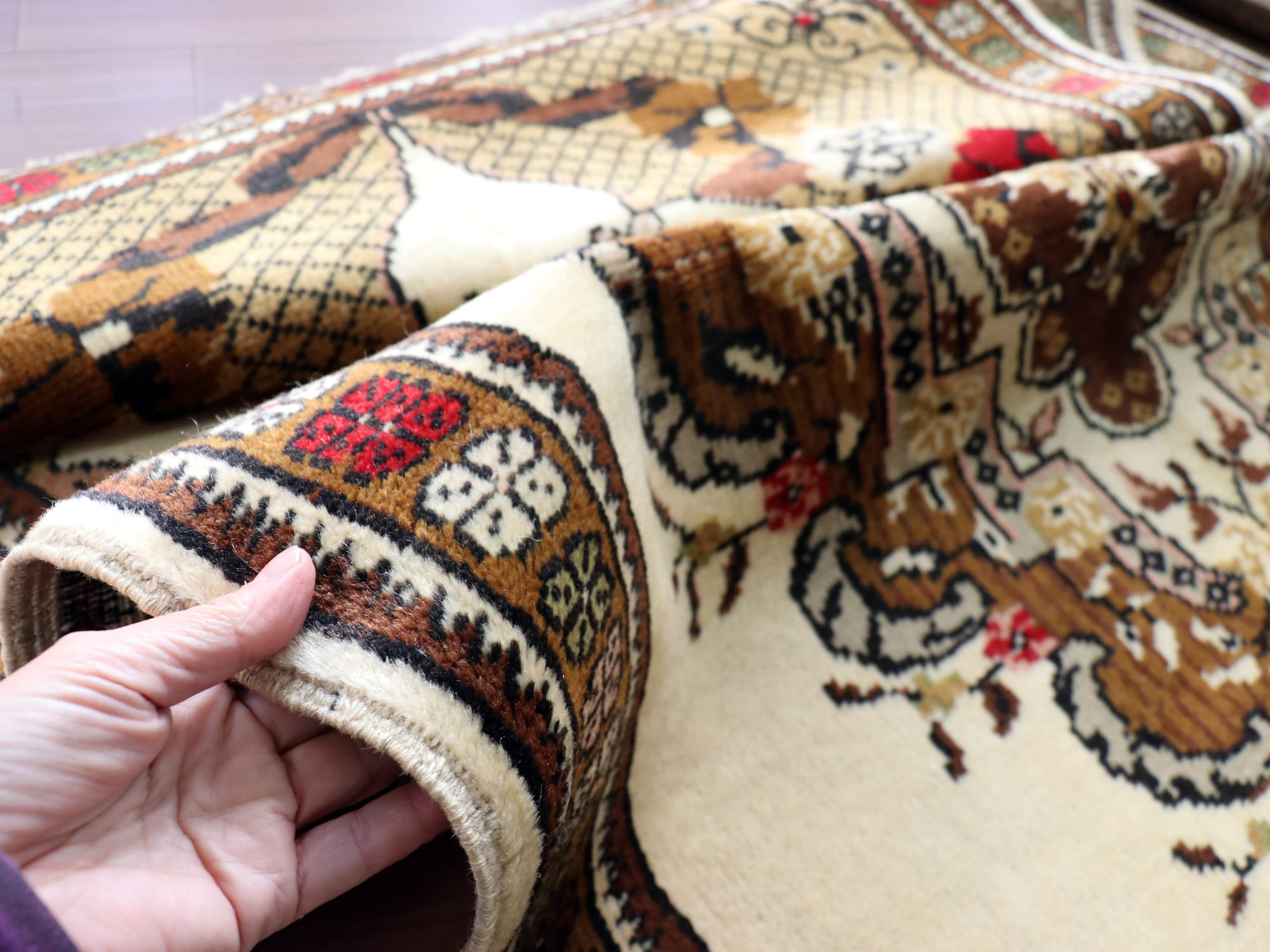 | ベージュのフィールドに、ブラウン系のメダリオンが織り込まれ、周囲はバラの花で飾られたエレガントなデザイン。写真では白っぽく見えますが、ベージュのフィールドは黄色みが強いアイボリーで染色してある色です。どことなくヨーロッパの雰囲気も出ていて、アンティーク家具によく合います。 |
