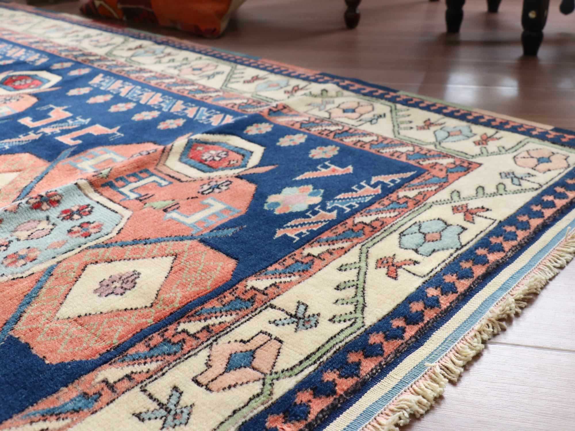 | エーゲ海に近いマニサ地方で、2000年を超えてから織られた手織り絨毯です。アンティークラグを模したデザインで、オリジナルはコーカサス地方デルベントのものでしょう。くっきりとした紺色に、直線的なラインの花のようなモチーフが並んだデザインがユニークです。両サイドはパイル(毛足)のないキリム織りでカラフルに縁どられ、丁寧な作りであることがわかります。 |