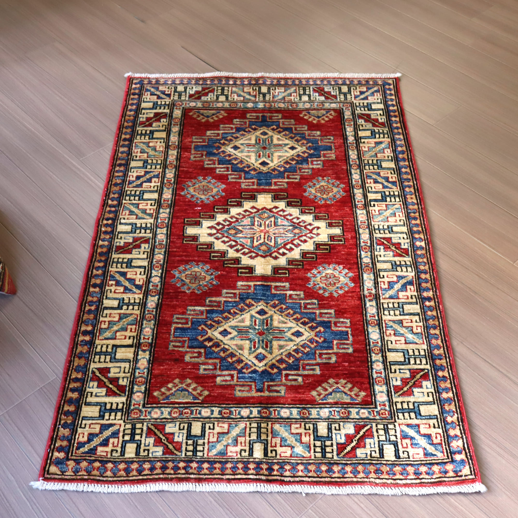 トルコ絨毯 手織りラグ 143x90cm レッド リプロダクト コーカサス地方の伝統柄
