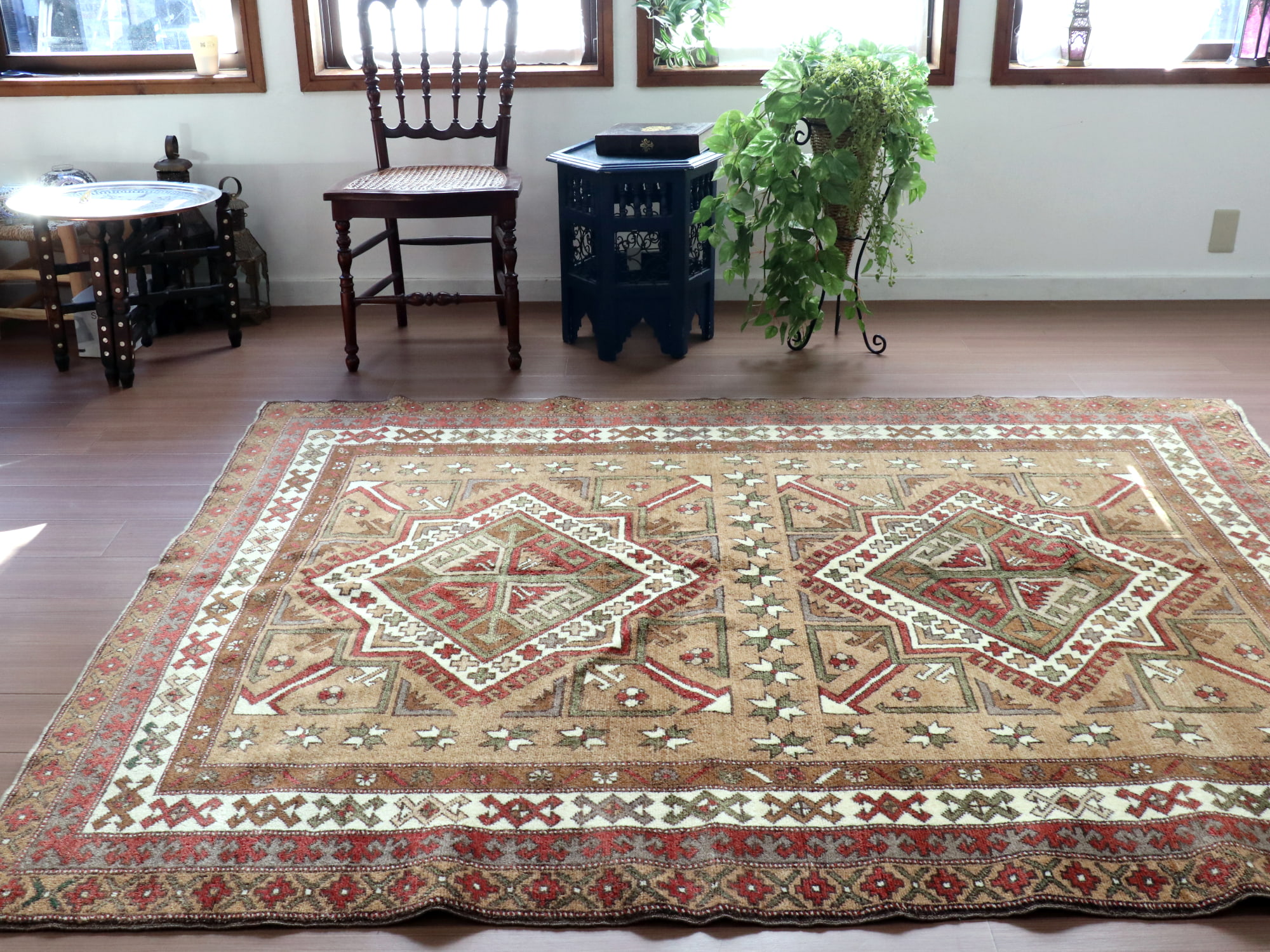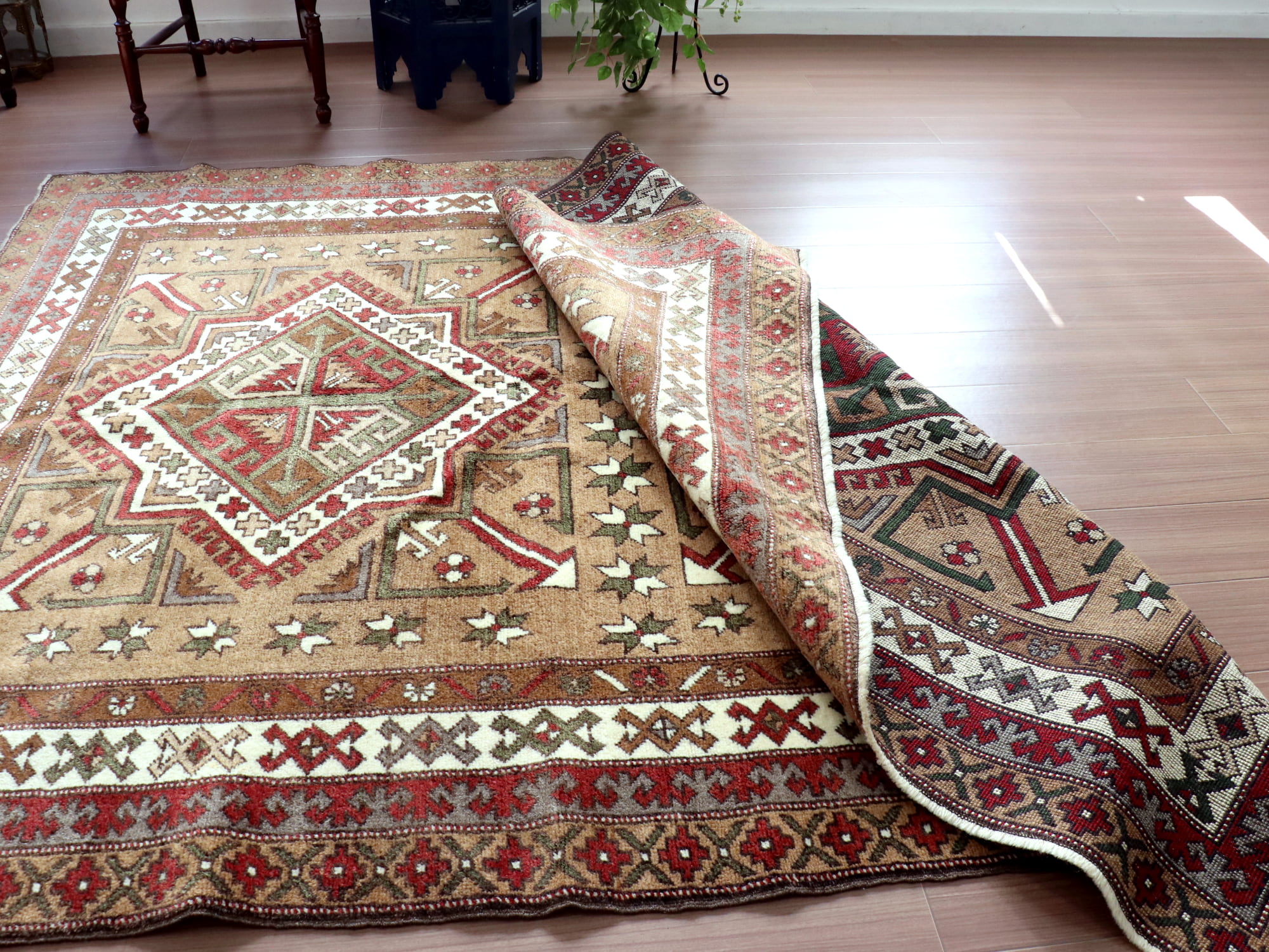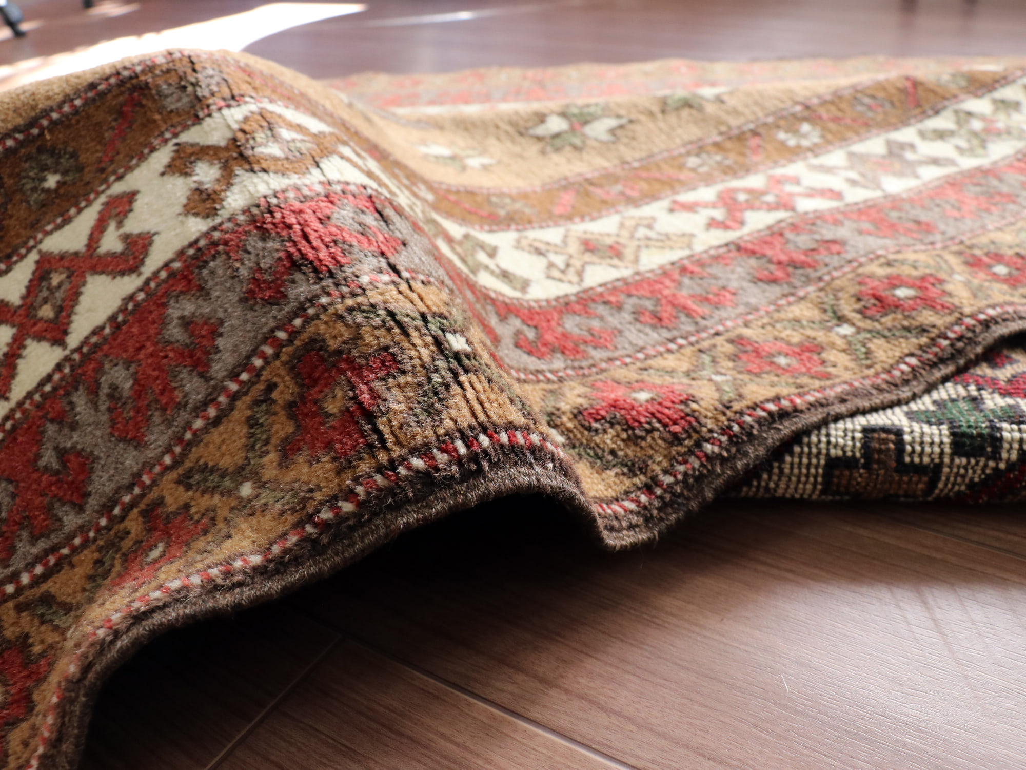 | トーンの違うブラウンと、オリーブグリーン、ボルドーのシックな色使い。コーカサス地方の伝統柄を織り込んだもので、アンティークカーペットのコレクターにも人気がある伝統柄です。 トルコ絨毯の特徴として、カーペットといっても、中国段通やペルシャ絨毯とは違った質感で、厚みはあってもやわらかな織り地です。世界で唯一ダブルノット(毛糸の結び目が軸に対して2回転している)で織られるアナトリアカーペットは、数百年の時代を経ても、磨り減ることはあるもののしっかり毛足(パイル)が下地に残っているほど丈夫です。 |