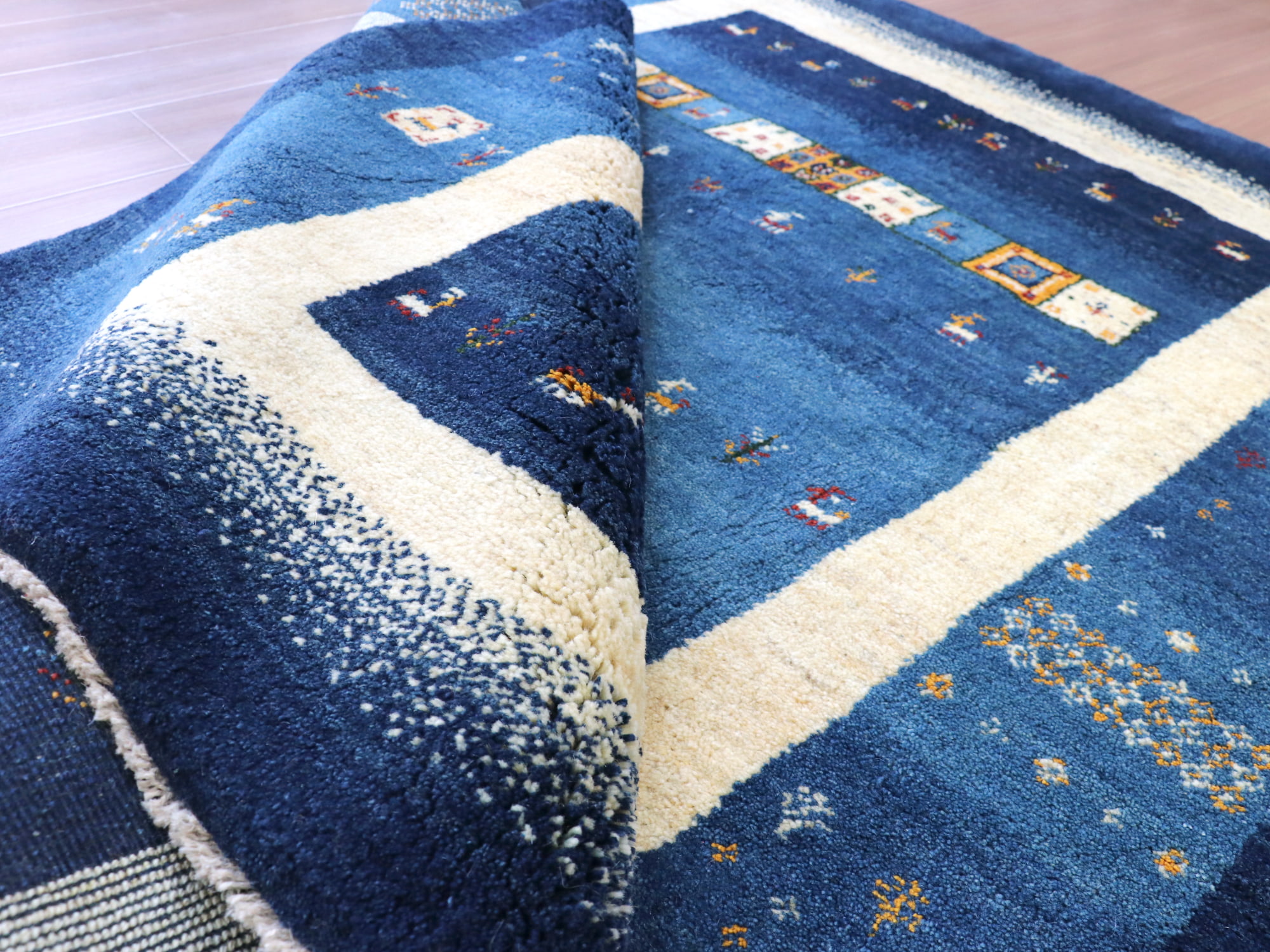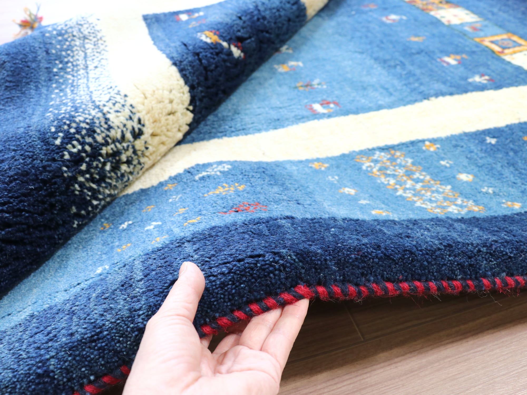 - ギャベ ギャッベ イラン産手織り 195x155cm ブルーグラデーション アイボリーのボーダー