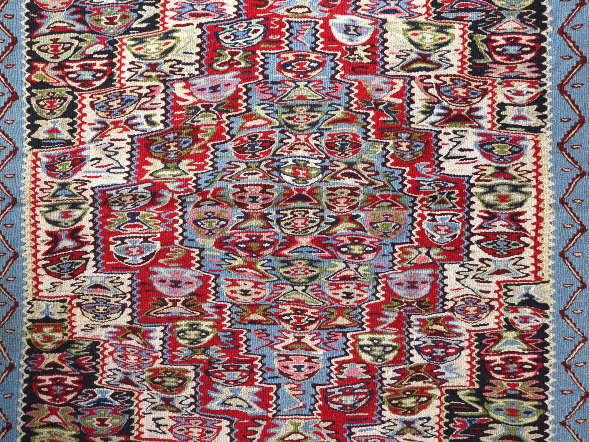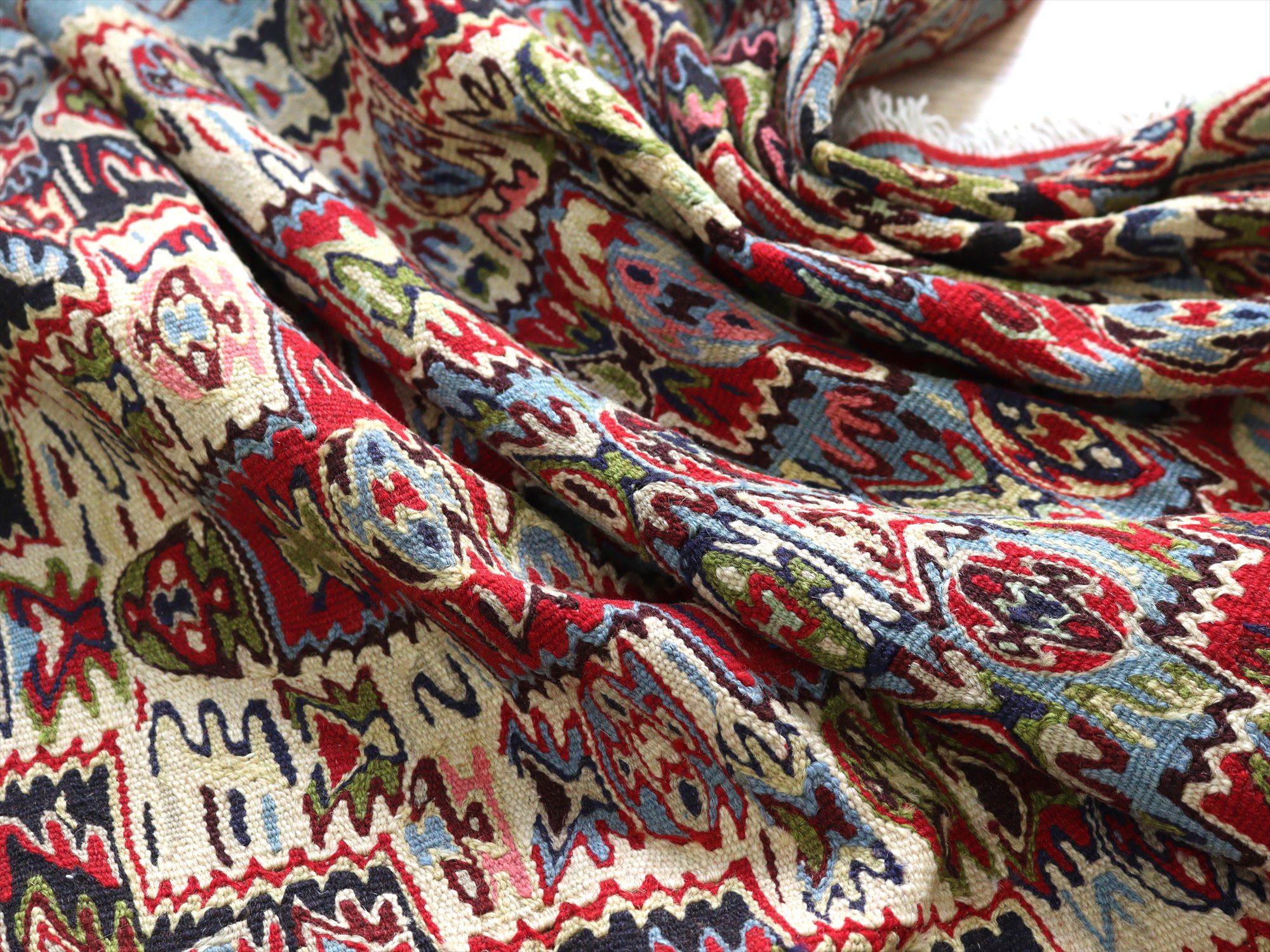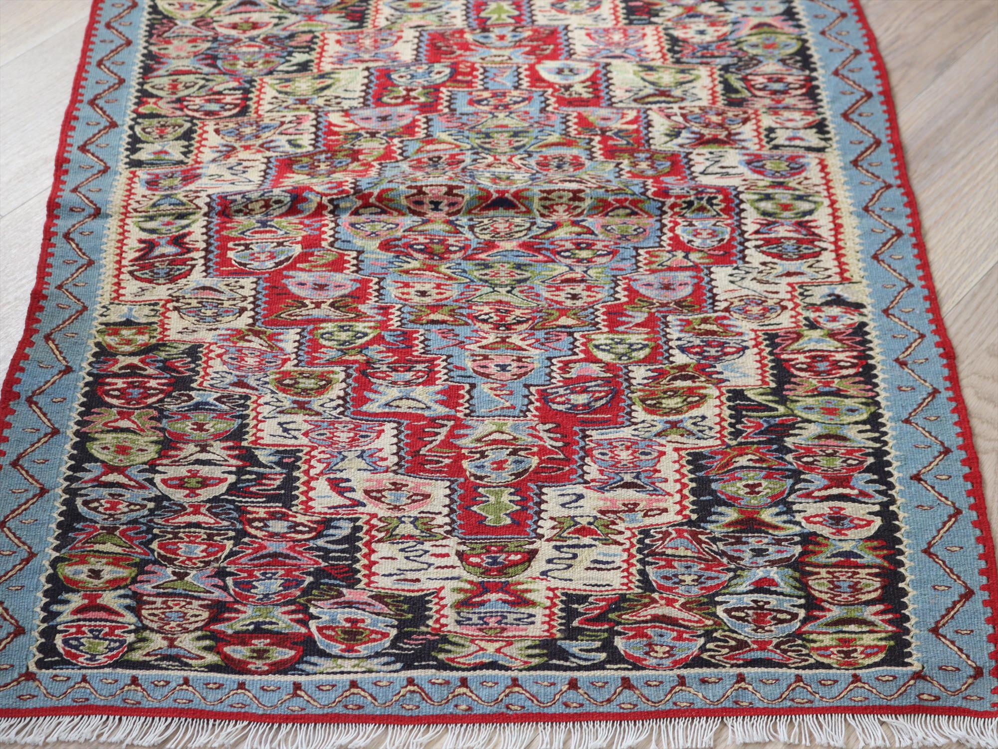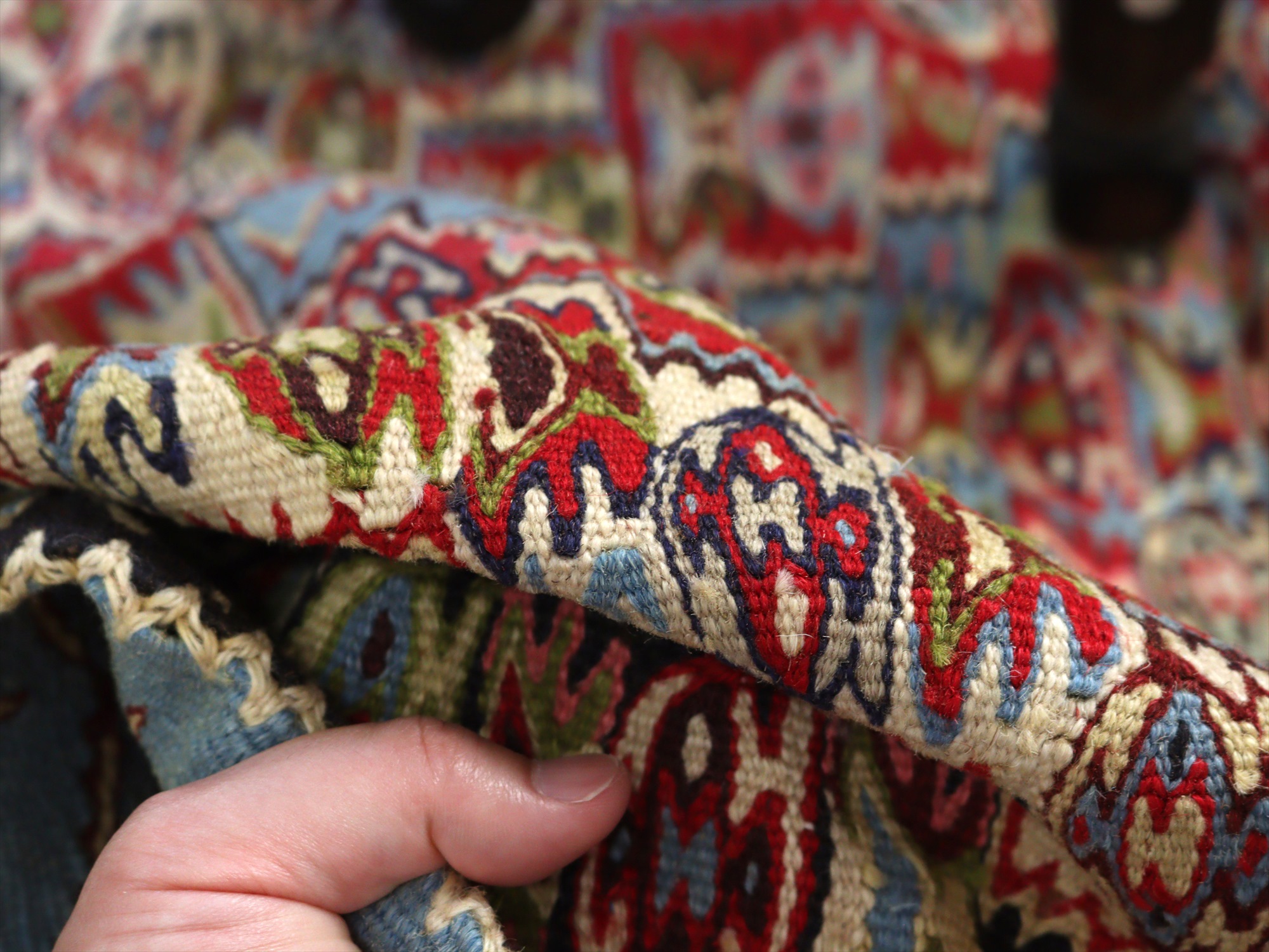 イラン南西部、トルコとの国境に近いセネという町の特徴あるキリム。この地域は、カシュカイ族やクルド族など、ワイルドな織りのキリムが多いのですが、セネだけは趣が違っています。サファビー王朝が好んで使ったという六角形のメダリオンに、ペルシャじゅうたんを思わせる細かなアラベスク模様をちりばめたデザインになっていて、遊牧民を思わせるキリムとはまた異なるデザインです。 |