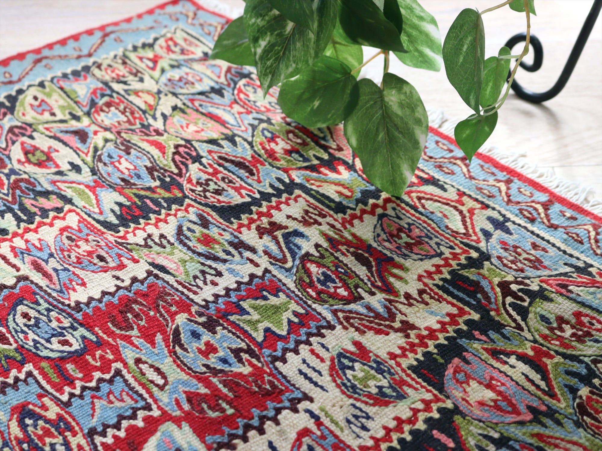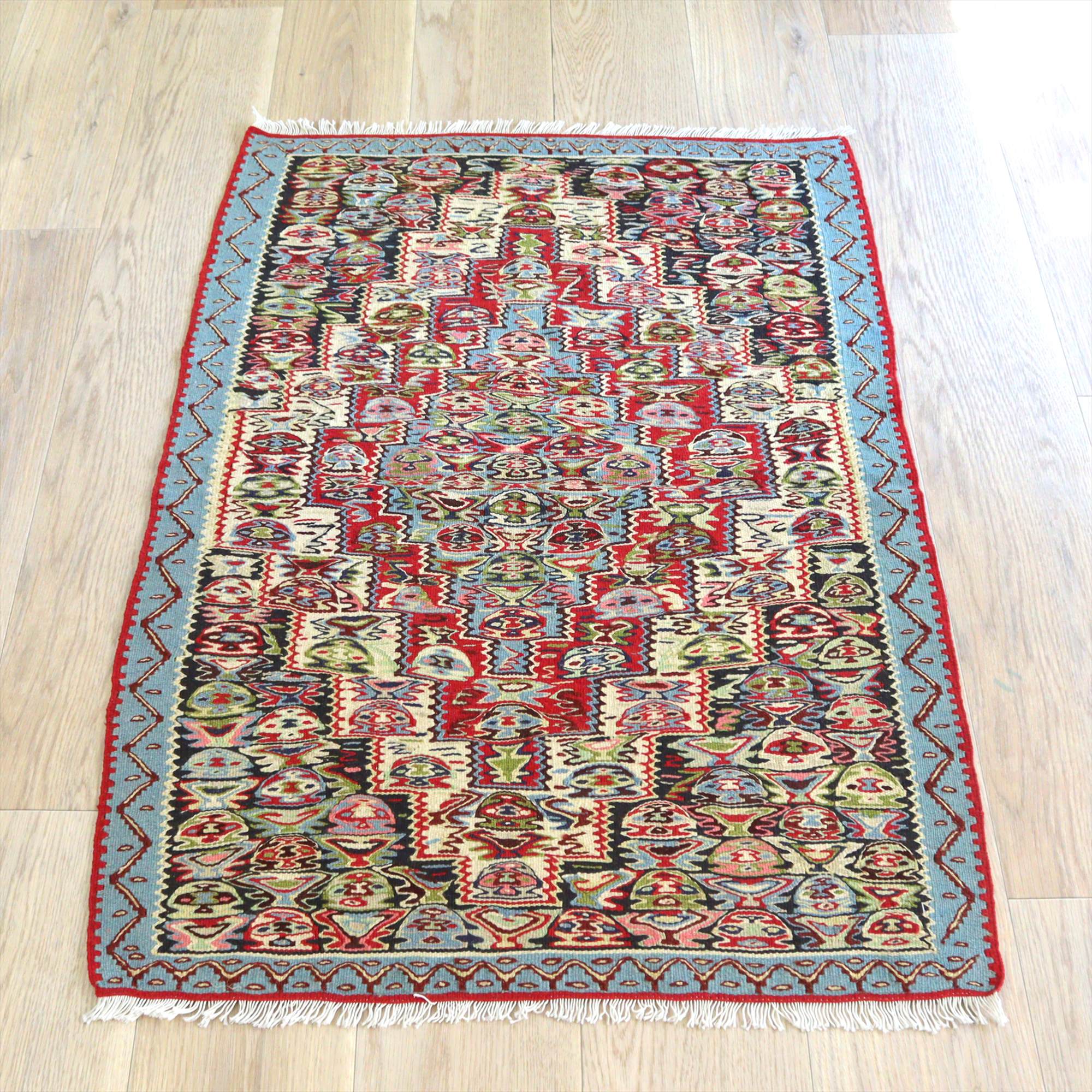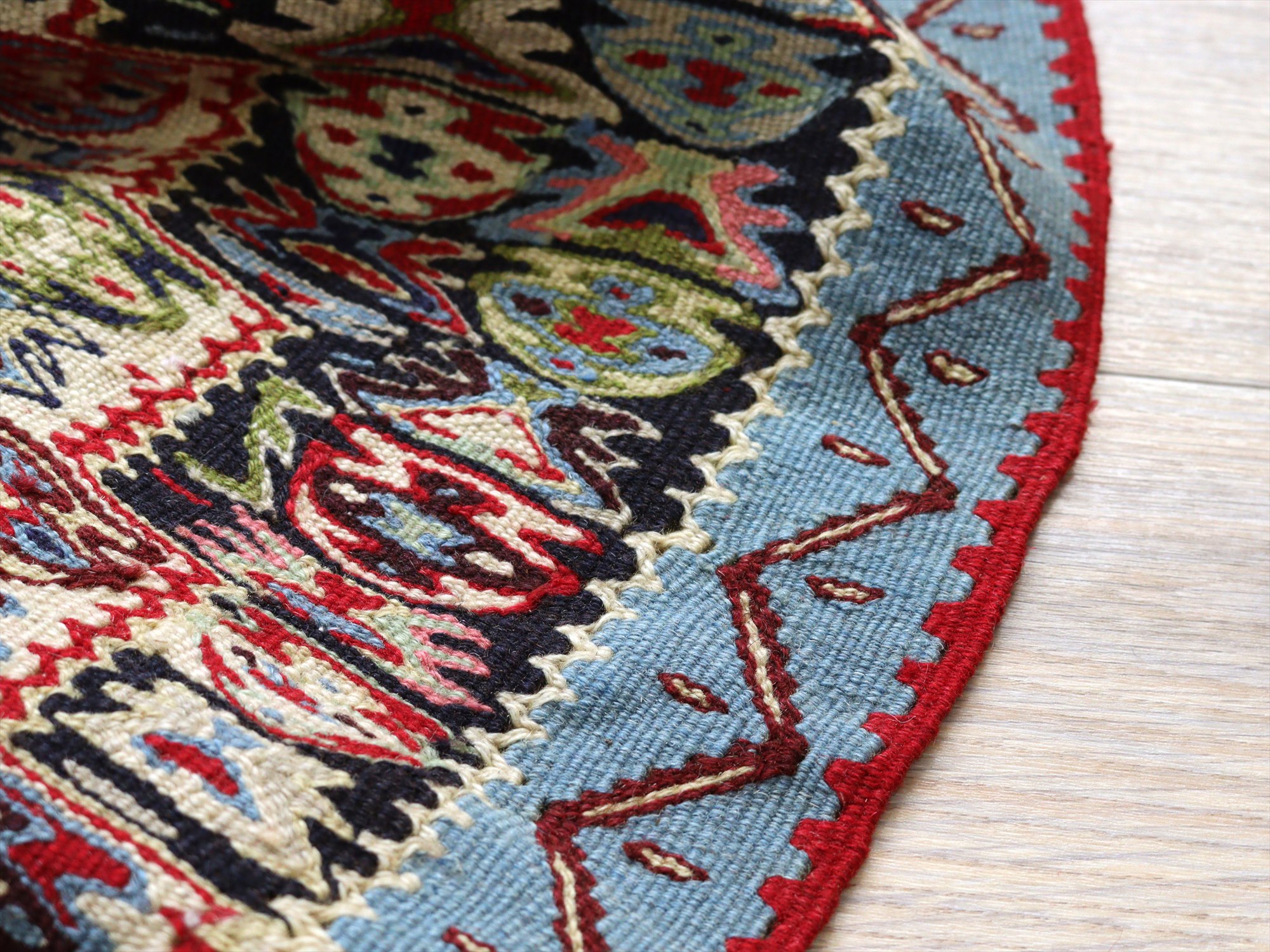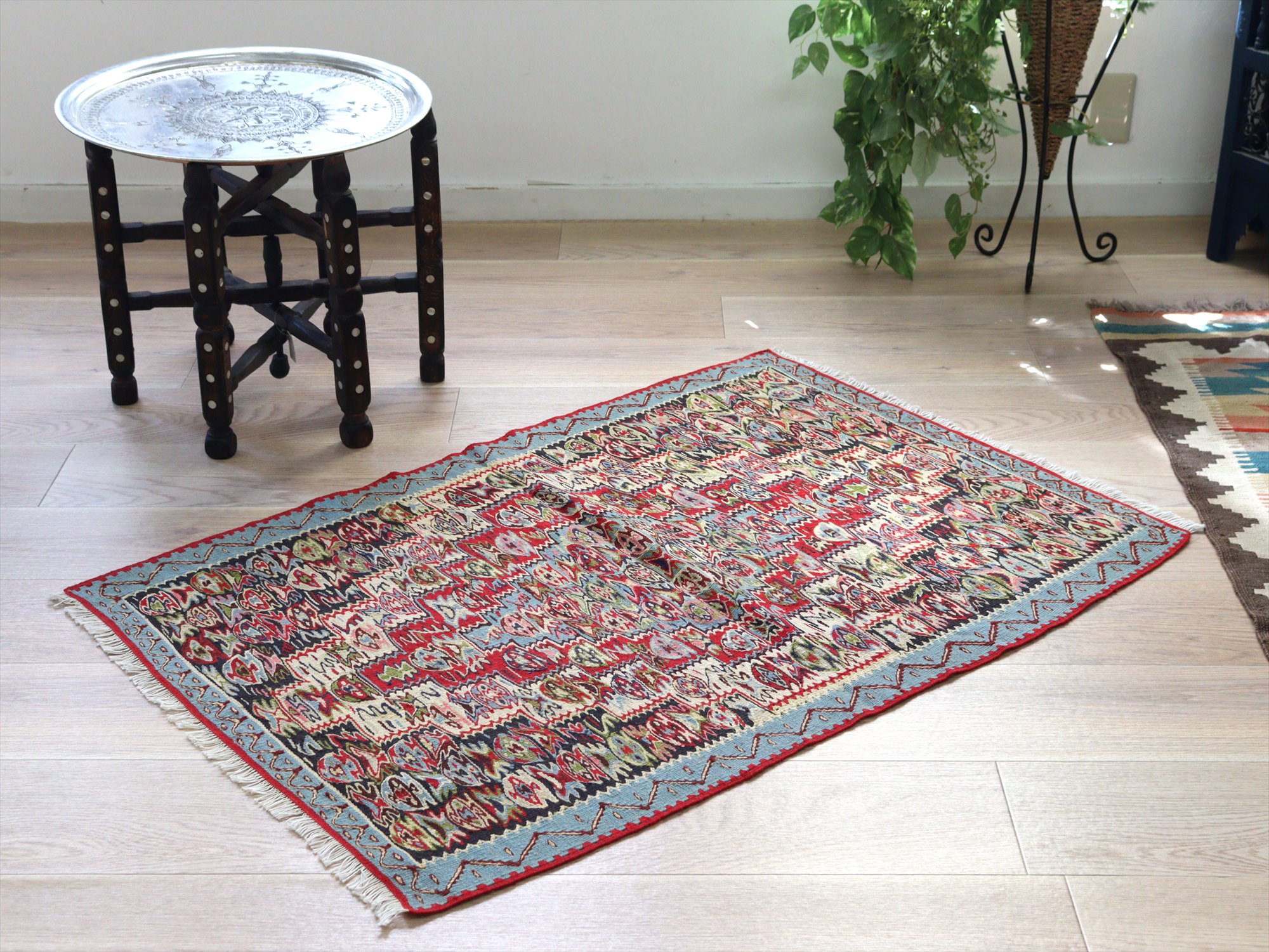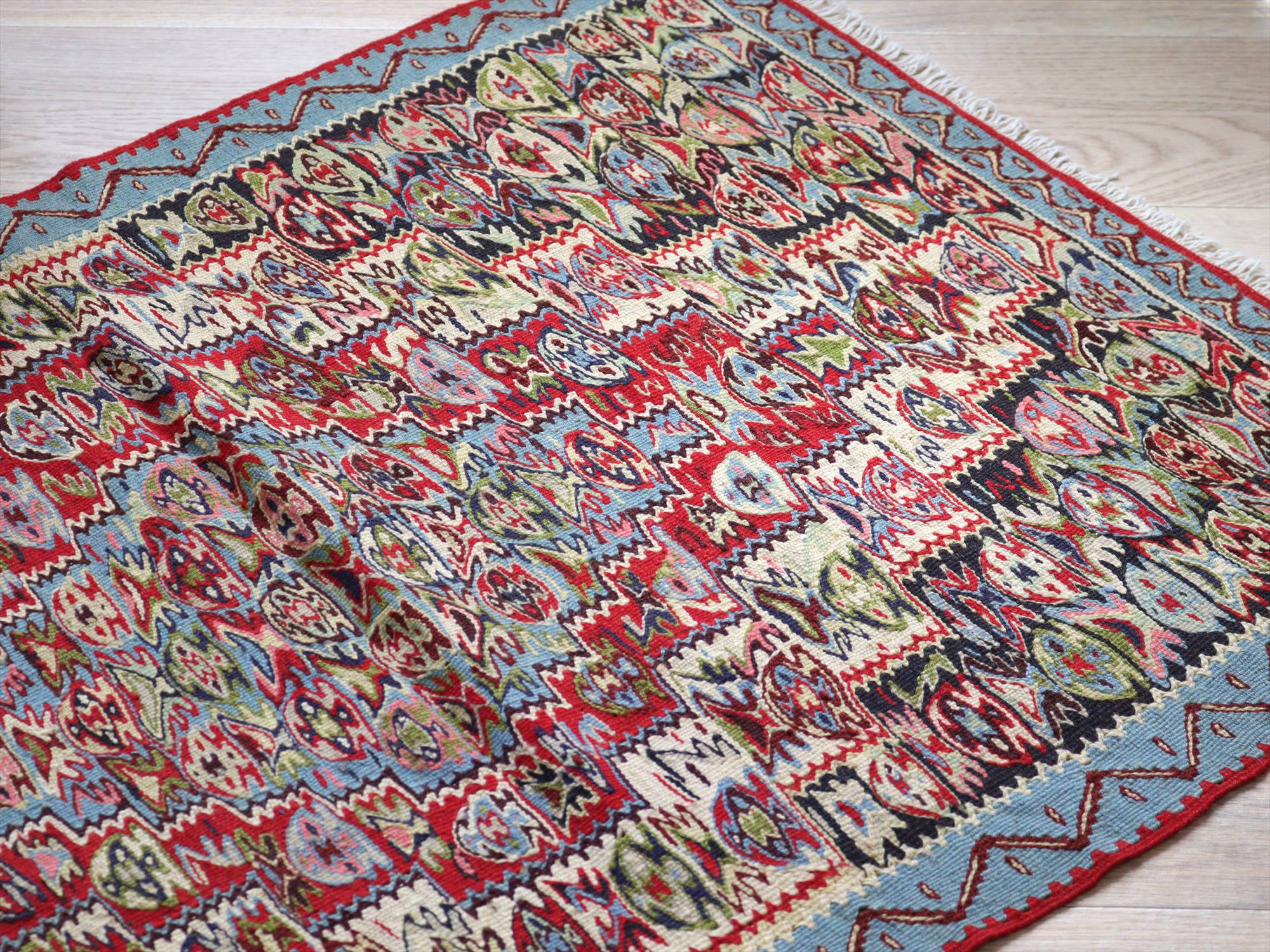 イラン南西部、トルコとの国境に近いセネという町の特徴あるキリム。この地域は、カシュカイ族やクルド族など、ワイルドな織りのキリムが多いのですが、セネだけは趣が違っています。サファビー王朝が好んで使ったという六角形のメダリオンに、ペルシャじゅうたんを思わせる細かなアラベスク模様をちりばめたデザインになっていて、遊牧民を思わせるキリムとはまた異なるデザインです。 |