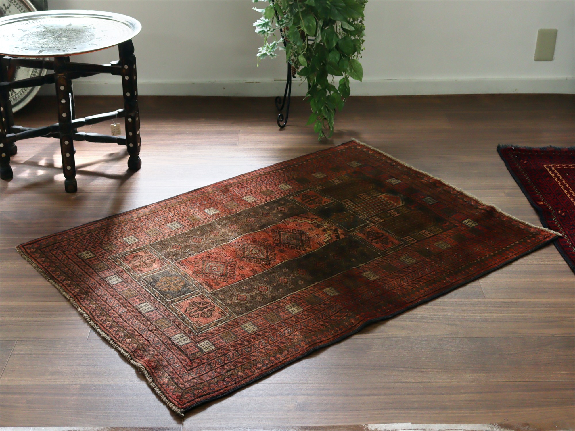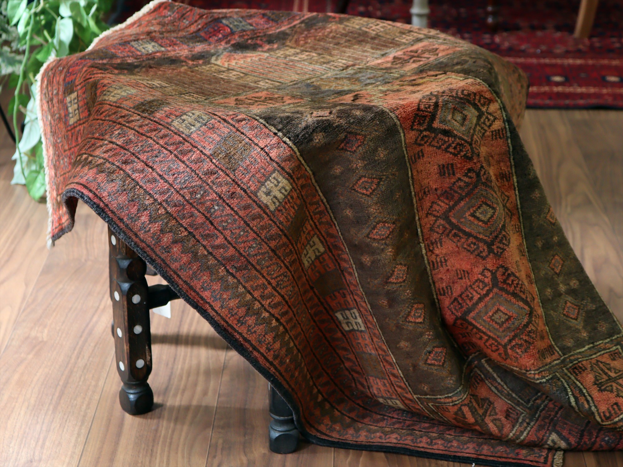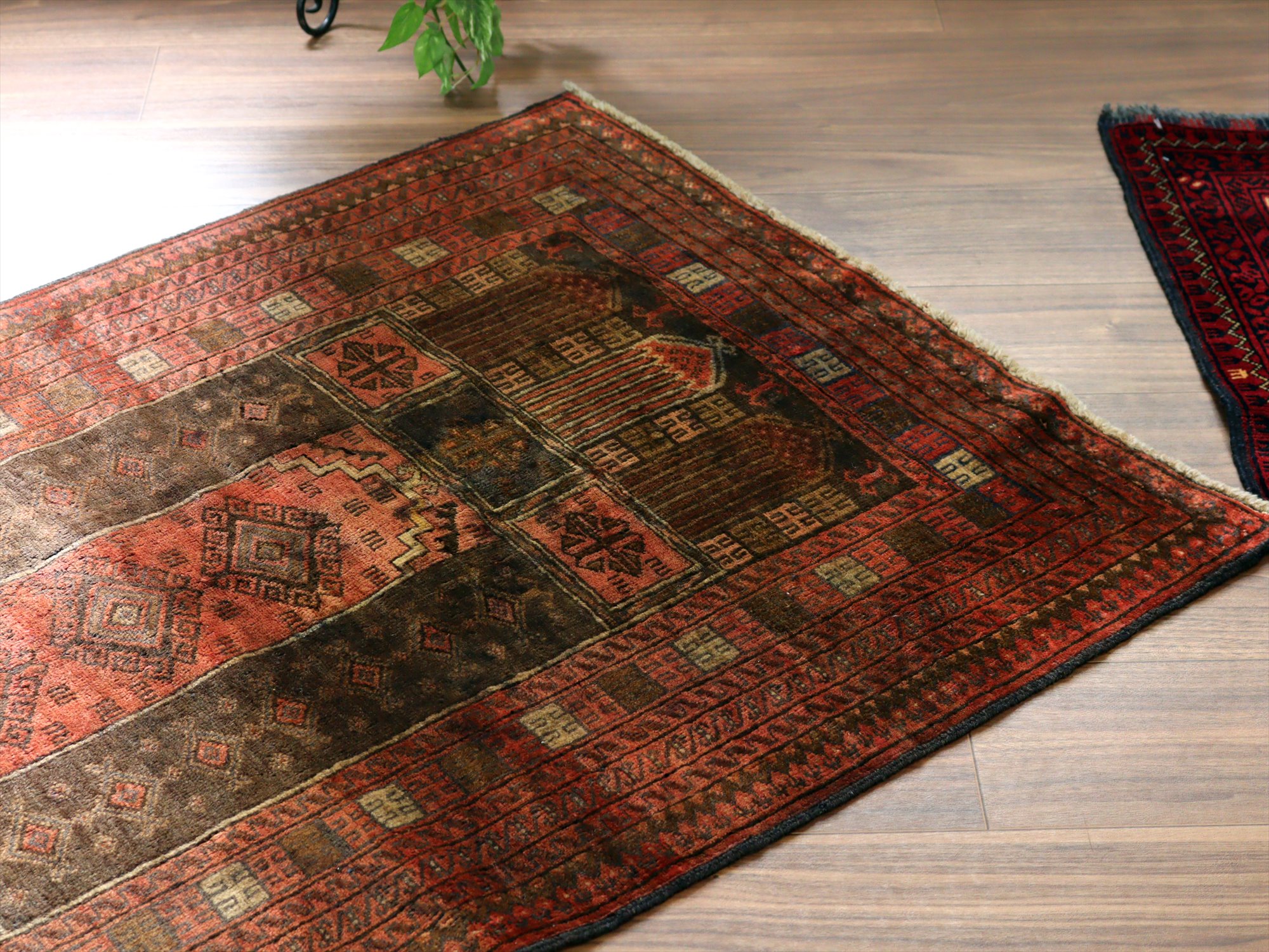 朱色に近いレッドとブラウンを基調とした色使いで、お祈りのくぼみを示すミフラープと幾何学模様が織られています。くすんだ色合いになっていて、こなれた感が良く出ています。 |