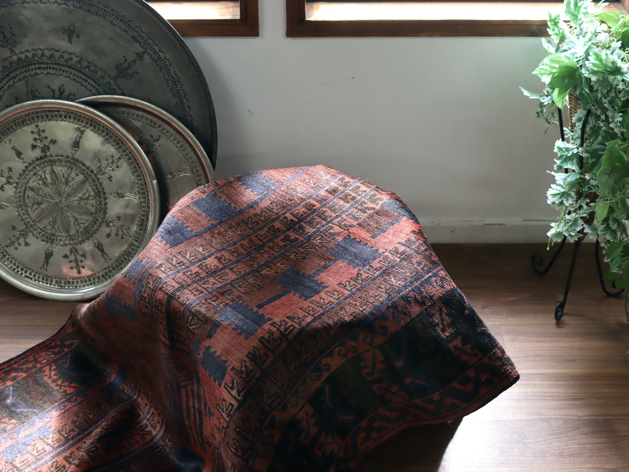 朱色とネイビーのコンビネーションで幾何学の模様が織られたデザイン。茶色がかったあずき色も使われていて、全体に良い塩梅で馴染んでいます。縦の長さに対し、横幅がやや短く細長いサイズ感です。 |