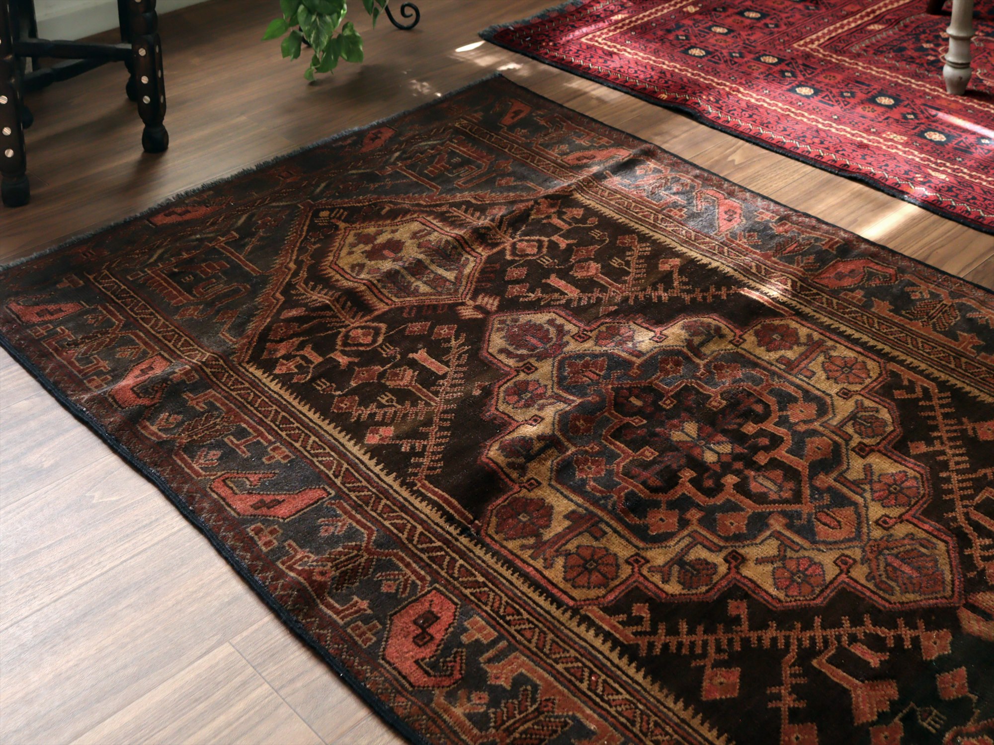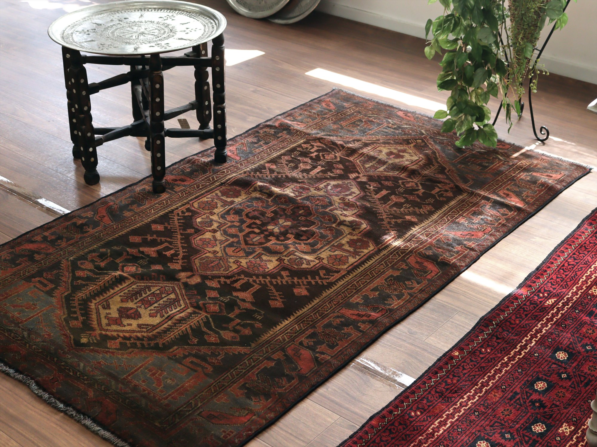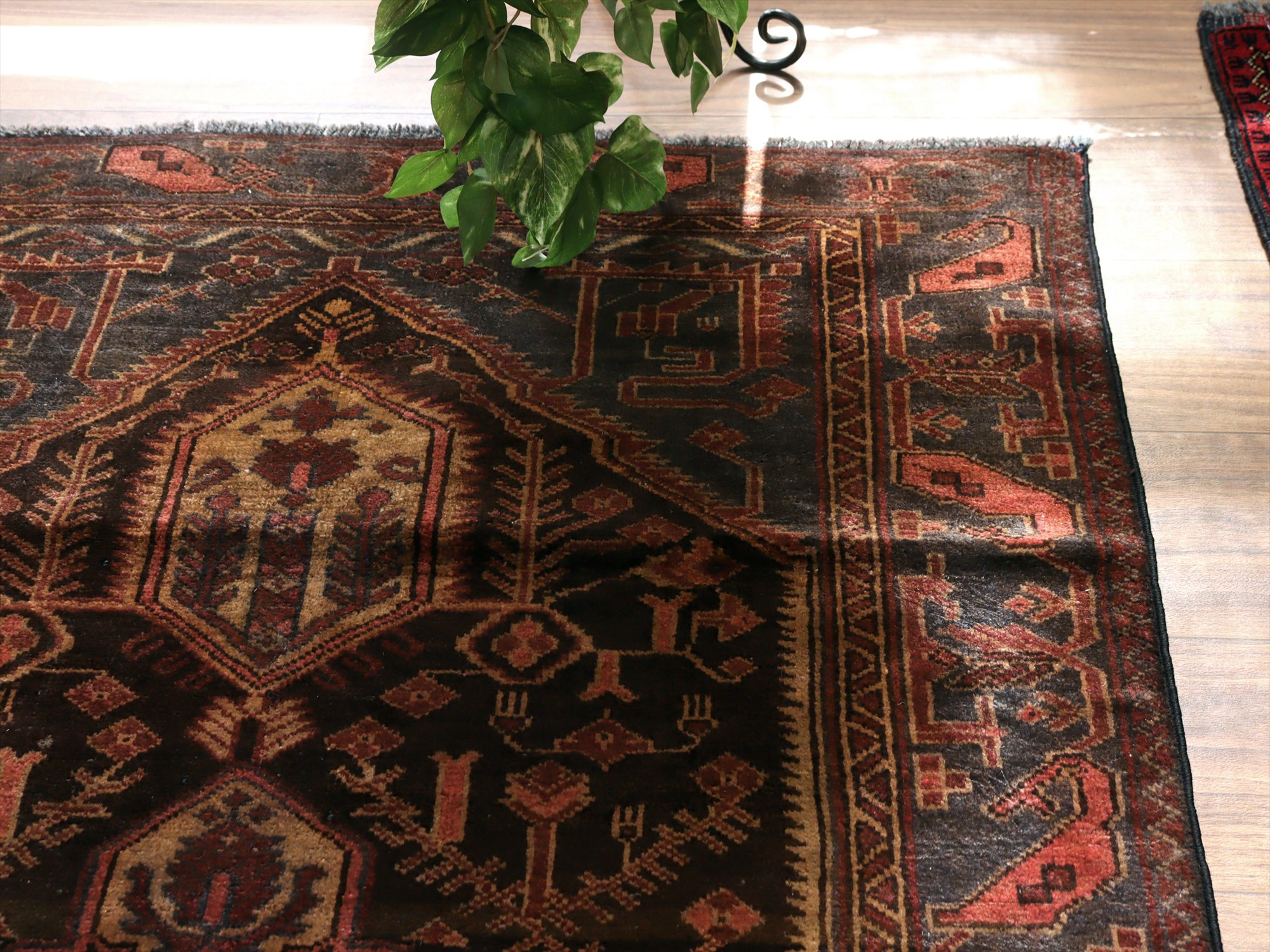 トライバルラグ バルーチ168×97cm 小花とメダリオン ダークブラウン