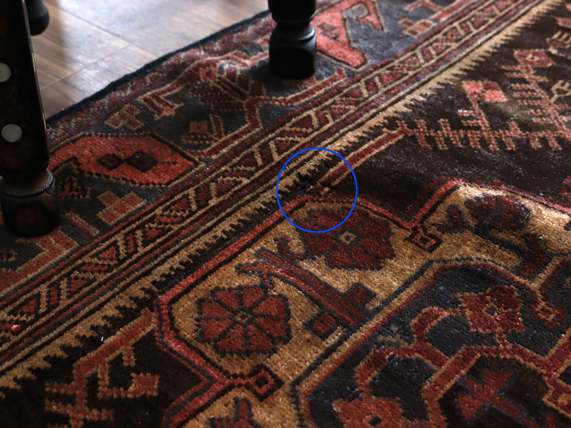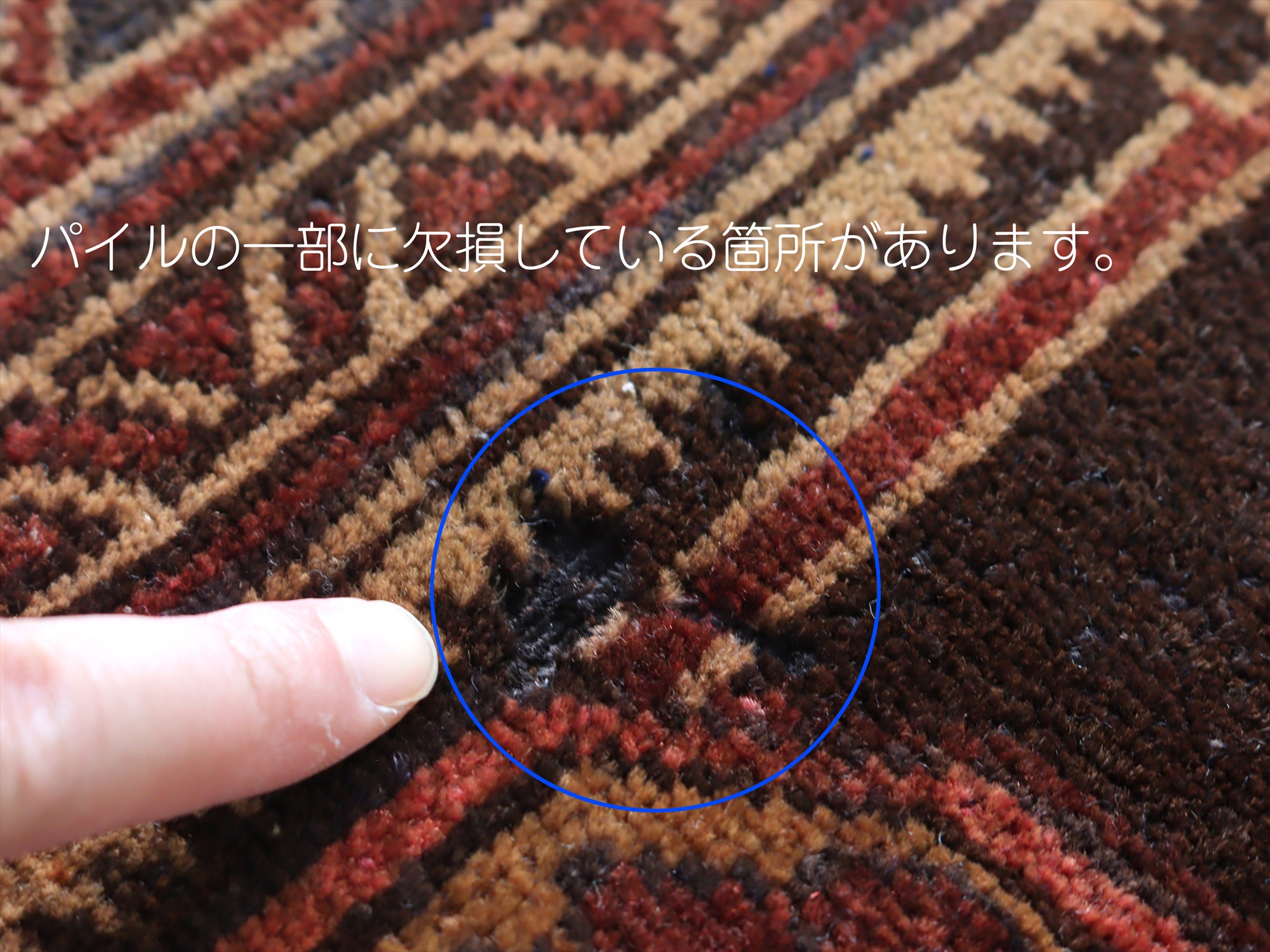 パイルの一部に欠損している箇所があります。ベースを含めたラグの厚みは7mm程で、パイルはすっきりと刈られています。 |