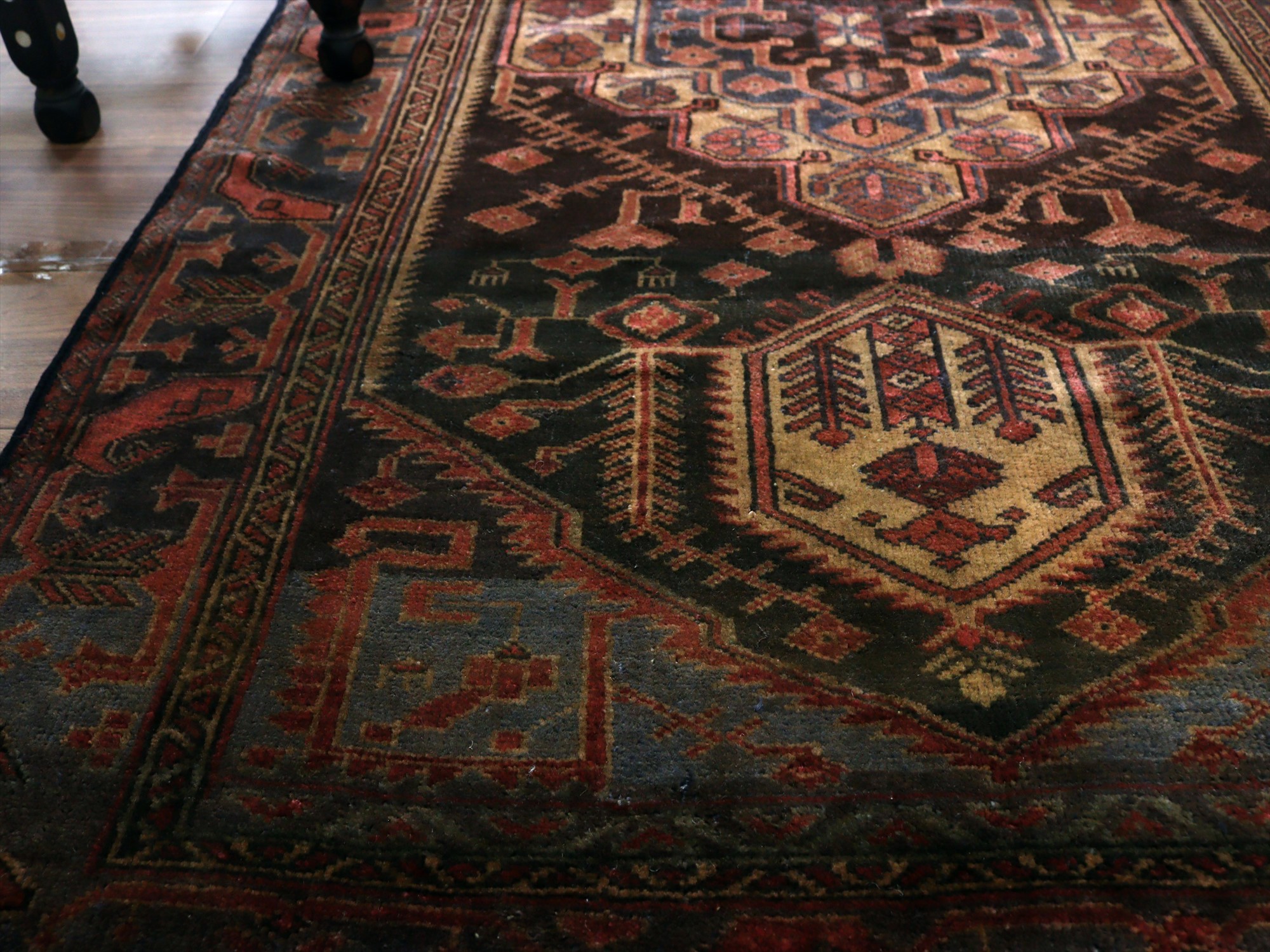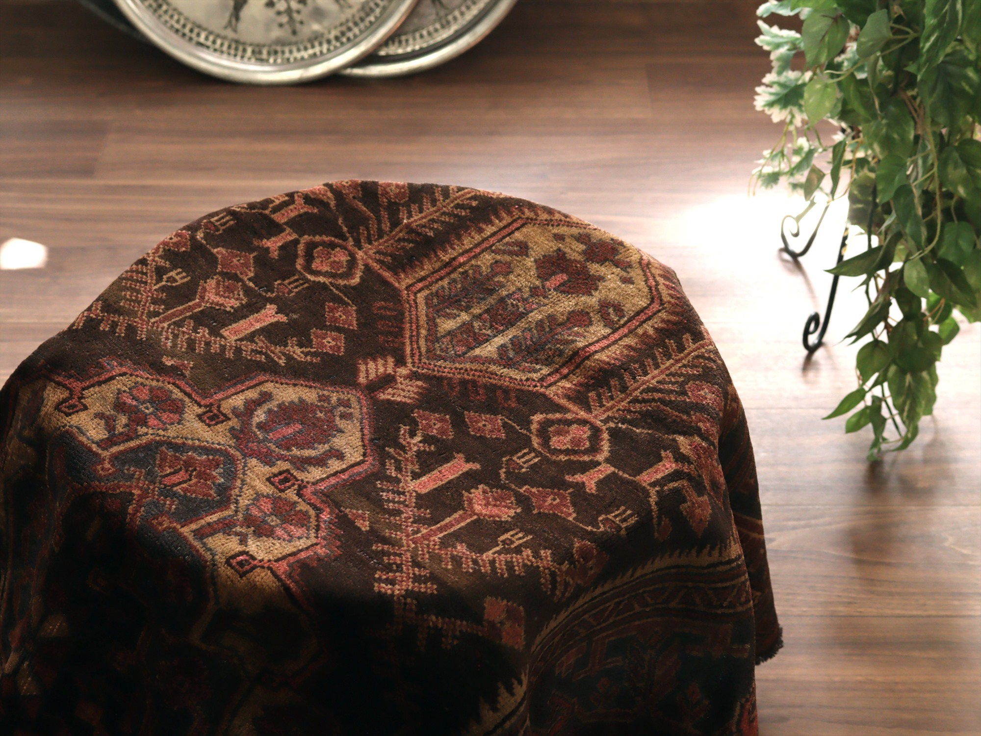 黒に近いダークブラウンをベースに、メダリオンや幾何学モチーフが織られたデザイン。落ち着いた色使いの中に、小花が程よい存在感を主張しています。また、ベースのブラウンが途中からグレーに色が切り替わっている点もユニークです。 |