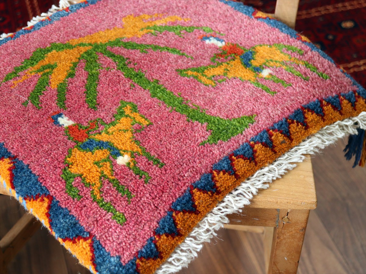 ギャッベ イラン産手織り 座布団サイズ41×43cm マゼンダ 向かい合う馬と遊牧民