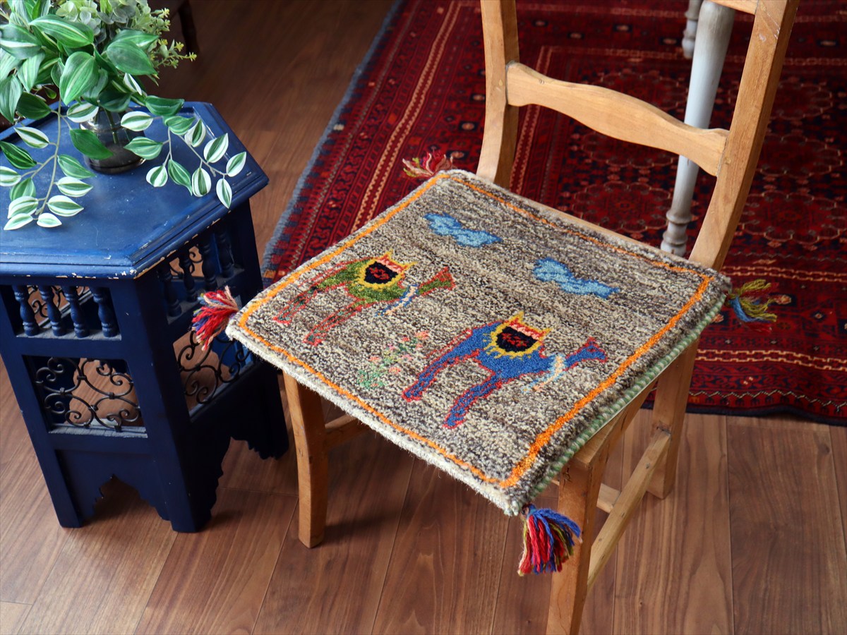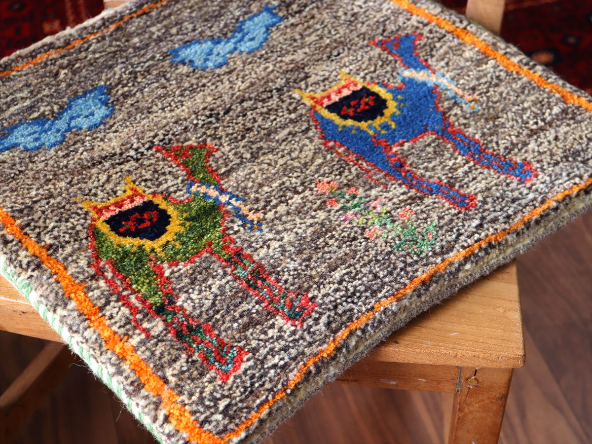 ギャッベ イラン産手織り 座布団サイズ41×42cm ナチュラルブラウングレー カラフルなラクダ