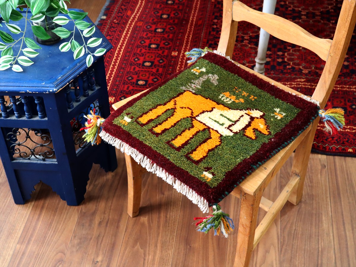 ギャッベ イラン産手織り 座布団サイズ40×37cm グリーン&イエロー 鋭い目つきのライオン