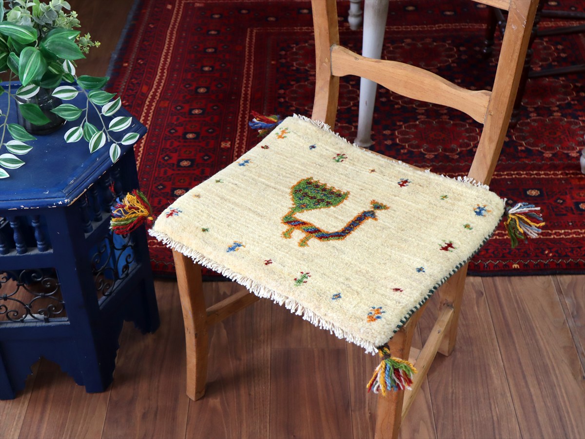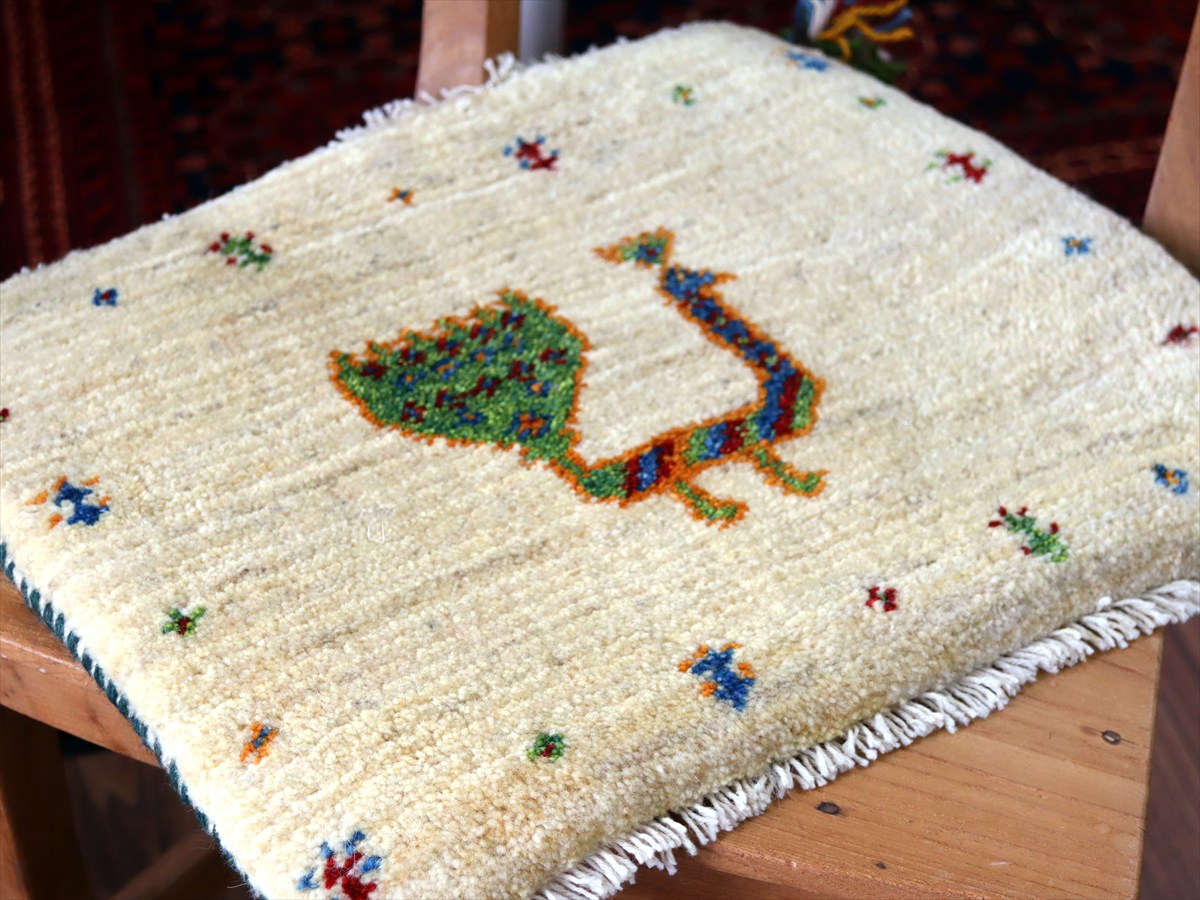 ギャッベ イラン産手織り 座布団サイズ38×43cm ナチュラルアイボリー カラフルな孔雀
